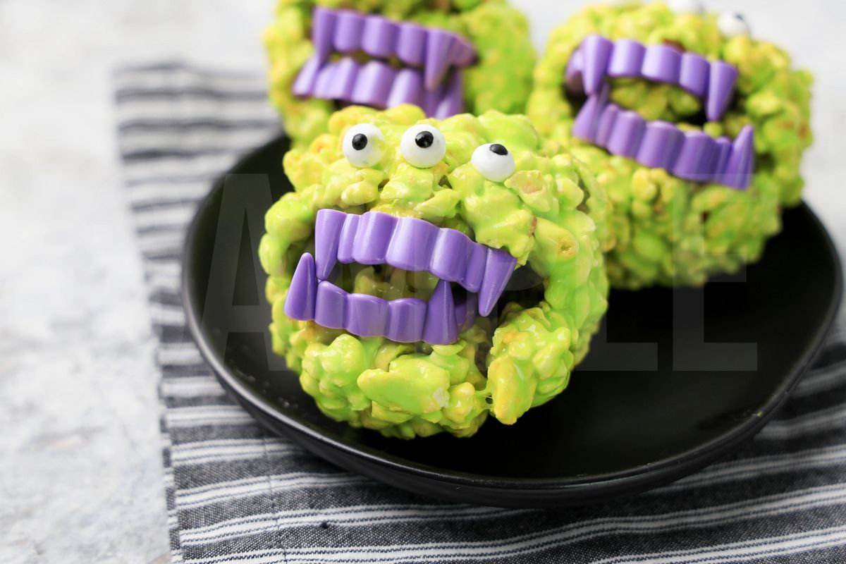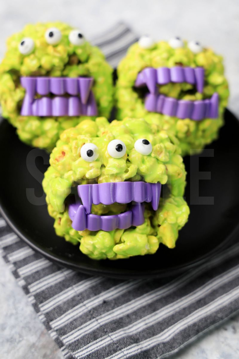 Monster Popcorn Balls is made with popcorn, white candy marshmallows, and vampire teeth. This is a semi exclusive recipe. The Monster Popcorn Balls comes a black plate with a gray striped napkin on a marble backdrop. Set comes with 7 in process (in process are the same for all sets) and 18 final shots (finals are different for each set) along with recipe in text format. Both vertical and horizontal shots are available for social media. One set of four. Sample removed on finals.