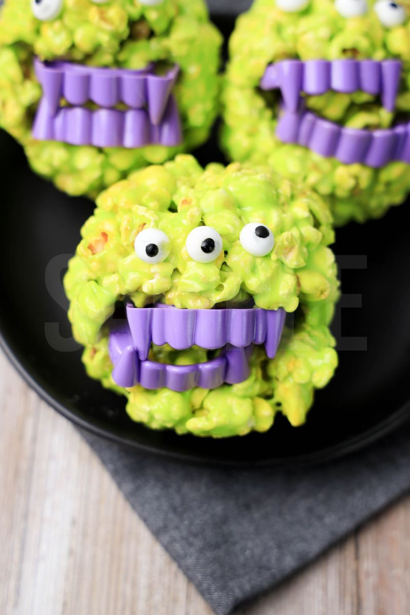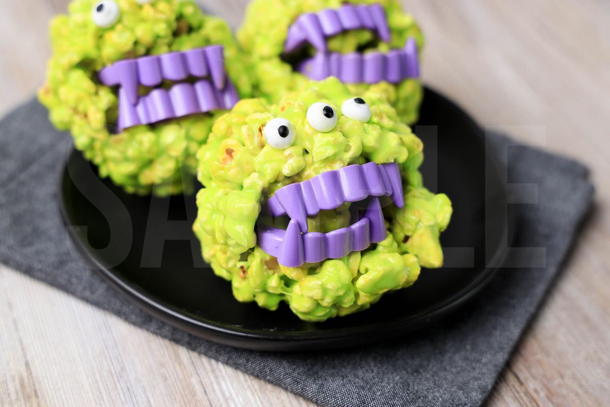 Monster Popcorn Balls is made with popcorn, white candy marshmallows, and vampire teeth. This is a semi exclusive recipe. The Monster Popcorn Balls comes a black plate with a denim napkin on a rustic wood backdrop. Set comes with 7 in process (in process are the same for all sets) and 20 final shots (finals are different for each set) along with recipe in text format. Both vertical and horizontal shots are available for social media. One set of four. Sample removed on finals.