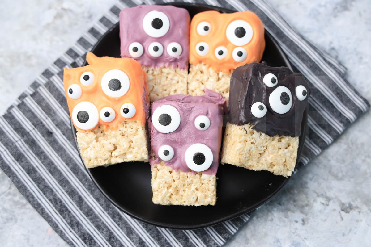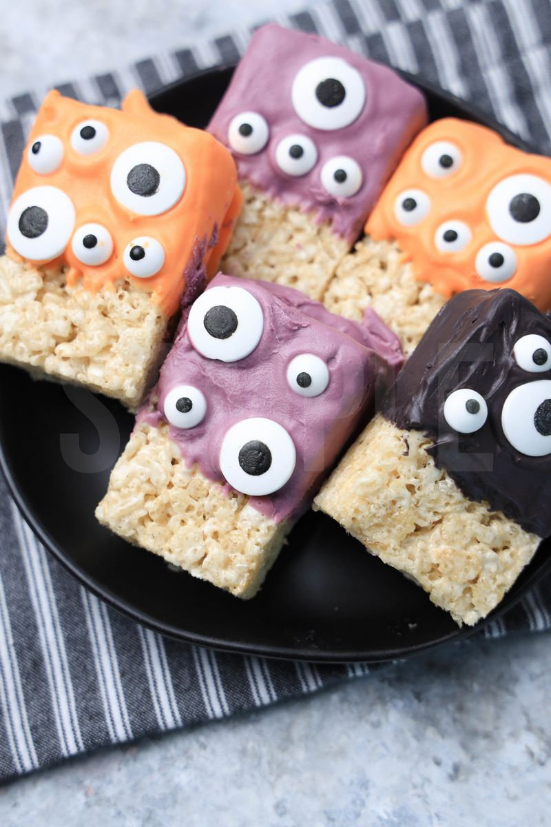 Monster Rice Krispy Treats is made with black candy melts, orange candy melts, and candy eye sprinkles. This is a semi exclusive recipe. The Monster Rice Krispy Treats comes on a white plate with a gray striped napkin on a marble backdrop. Set comes with 15 in process (in process are the same for all sets) and 17 final shots (finals are different for each set) along with recipe in text format. Both vertical and horizontal shots are available for social media. One set of four. Sample removed on finals.