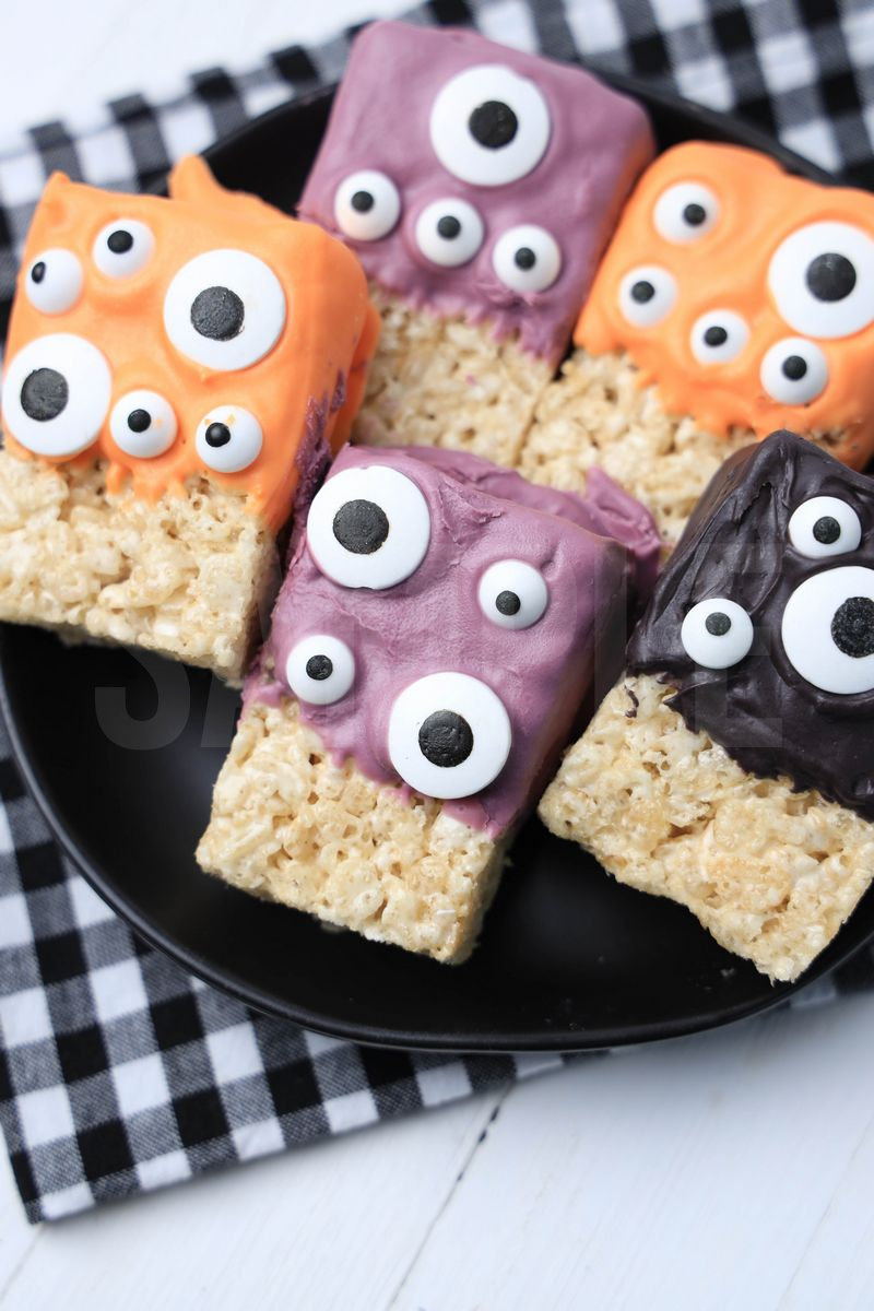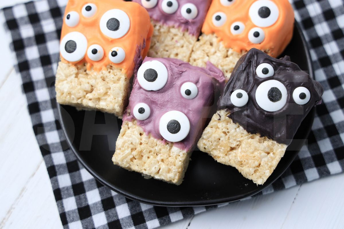 Monster Rice Krispy Treats is made with black candy melts, orange candy melts, and candy eye sprinkles. This is a semi exclusive recipe. The Monster Rice Krispy Treats comes on a white plate with a plaid napkin on a white wood backdrop. Set comes with 15 in process (in process are the same for all sets) and 17 final shots (finals are different for each set) along with recipe in text format. Both vertical and horizontal shots are available for social media. One set of four. Sample removed on finals.