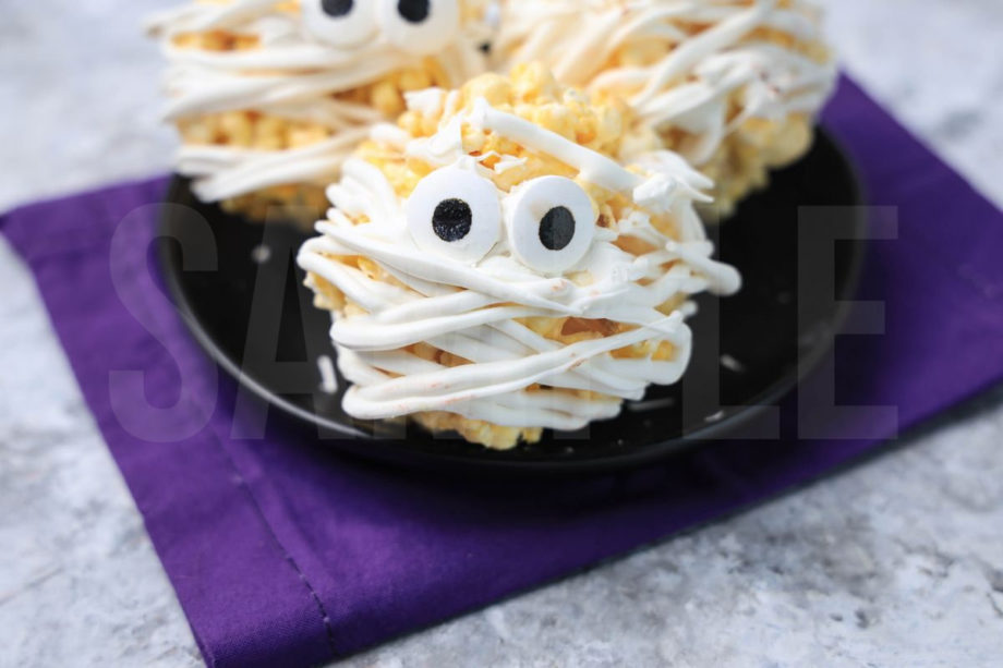 Mummy Popcorn Balls is made with popcorn, white candy melts, and candy eye sprinkles. This is a semi exclusive recipe. The Mummy Popcorn Balls comes on a black plate with a purple napkin on a marble backdrop. Set comes with 10 in process (in process are the same for all sets) and 18 final shots (finals are different for each set) along with recipe in text format. Both vertical and horizontal shots are available for social media. One set of four. Sample removed on finals.