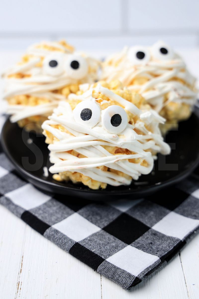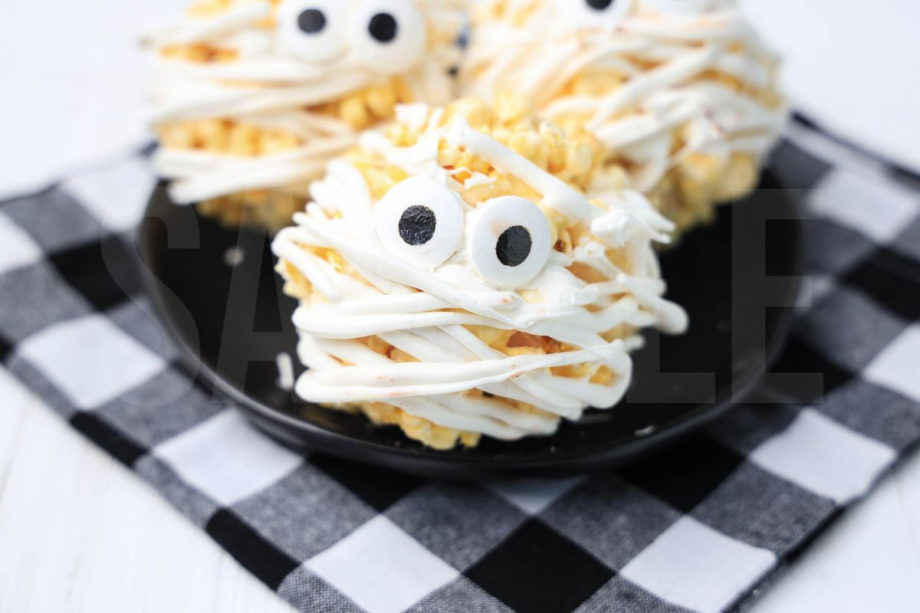 Mummy Popcorn Balls is made with popcorn, white candy melts, and candy eye sprinkles. This is a semi exclusive recipe. The Mummy Popcorn Balls comes on a black plate with a plaid napkin on a white wood backdrop. Set comes with 10 in process (in process are the same for all sets) and 18 final shots (finals are different for each set) along with recipe in text format. Both vertical and horizontal shots are available for social media. One set of four. Sample removed on finals.