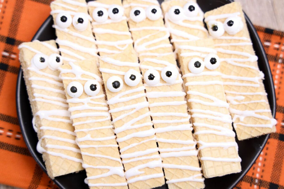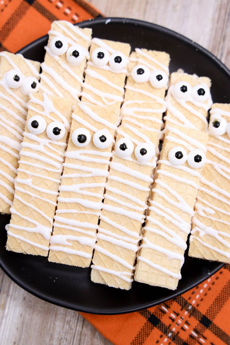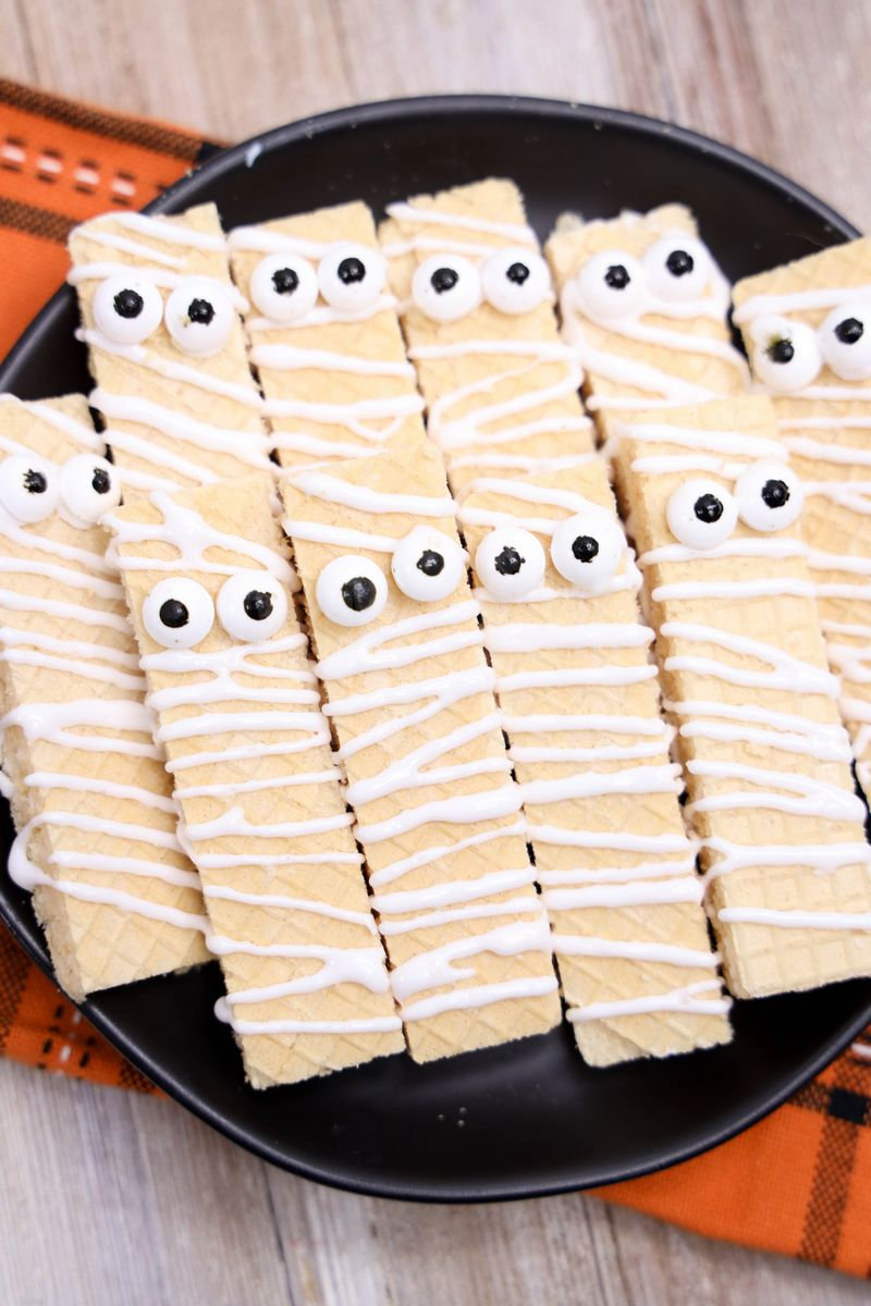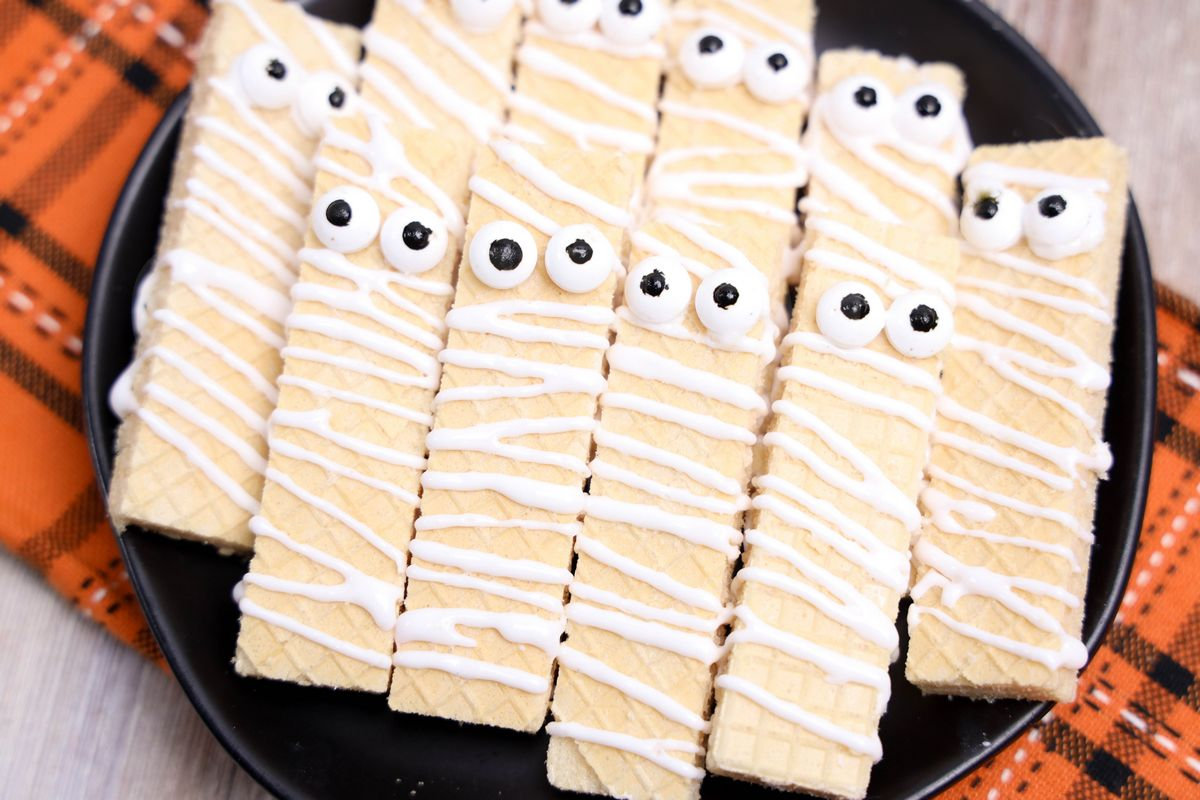 Mummy Wafers is made with vanilla wafers, white cookie icing, and candy eyes. This is a semi exclusive recipe. The Mummy Wafers comes on a black plate with a rustic wood backdrop. Set comes with 8 in process (in process are the same for all sets) and 15 final shots (finals are different for each set) along with recipe in text format. Both vertical and horizontal shots are available for social media. One set of four. Sample removed on finals.