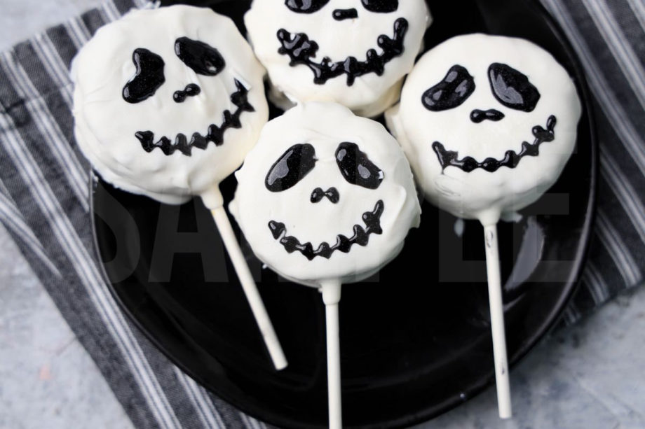 Nightmare Before Christmas Rice Krispy Pops is made with rice krispy treats, white candy melts, and .black sparkle gel. This is a semi exclusive recipe. The Nightmare Before Christmas Rice Krispy Pops comes a black plate with a gray striped napkin on a marble backdrop. Set comes with 6 in process (in process are the same for all sets) and 17 final shots (finals are different for each set) along with recipe in text format. Both vertical and horizontal shots are available for social media. One set of four. Sample removed on finals.
