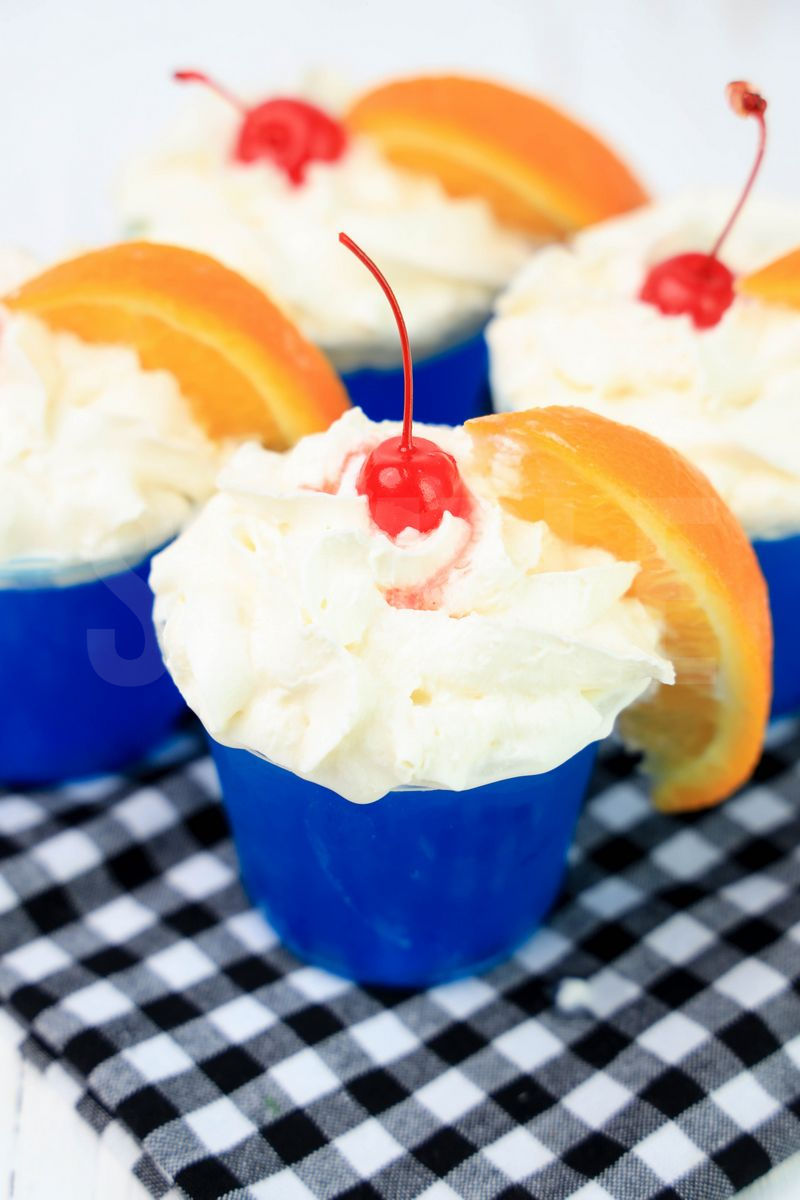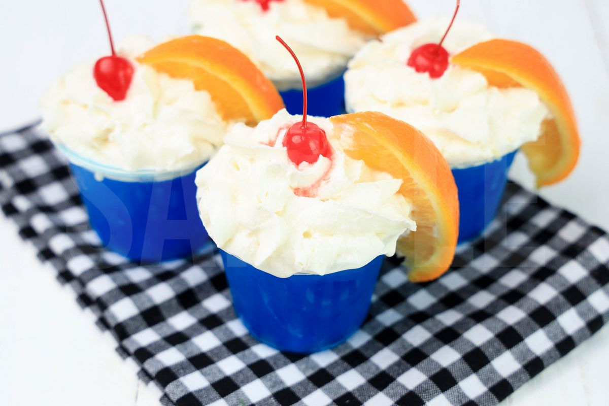 Ocean Water Jello Shots is made with ocean water jello mix, oranges, and maraschino cherries. This is a semi exclusive recipe. Recipe written for non alcoholic and alcoholic. The Ocean Water Jello Shots comes in clear cups on a plaid napkin with a white wood backdrop. Set comes with 14 in process (in process are the same for all sets) and 16 final shots (finals are different for each set) along with recipe in text format. Both vertical and horizontal shots are available for social media. One set of four. Sample removed on finals.