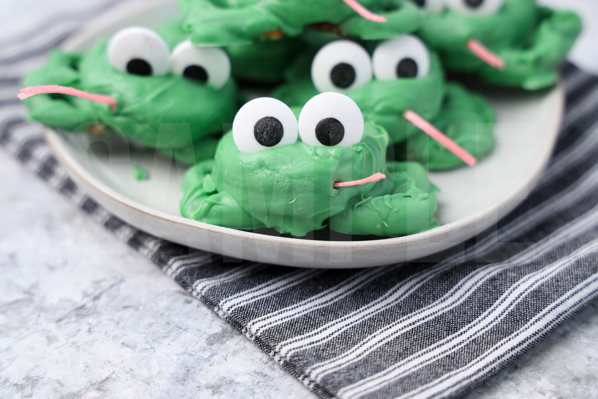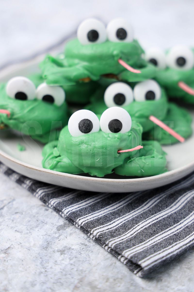 Oreo Frogs is made with oreos, green candy melts, and pretzels. This is a semi exclusive recipe. The Oreo Frogs comes on a white plate with a gray striped napkin on a marble backdrop. Set comes with 11 in process (in process are the same for all sets) and 15 final shots (finals are different for each set) along with recipe in text format. Both vertical and horizontal shots are available for social media. One set of four. Sample removed on finals.