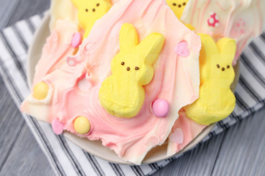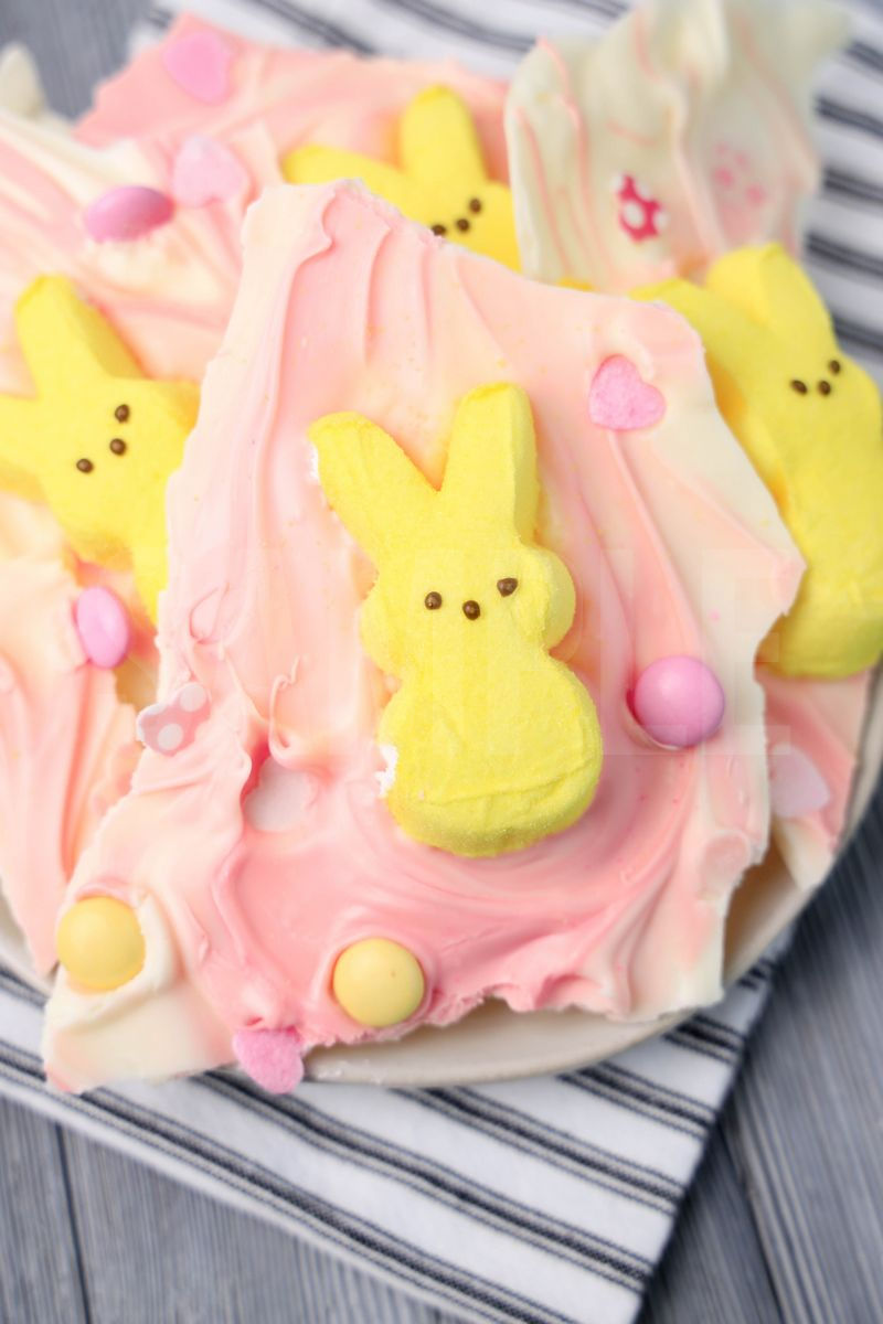 Peeps Bunny Bark is made with white candy melts, pink candy melts, and yellow peeps bunnies. This is a semi exclusive recipe. The Peeps Bunny Bark comes on a white plate with a white striped napkin on a gray wood backdrop. Set comes with 8 in process (in process are the same for all sets) and 17 final shots (finals are different for each set) along with recipe in text format. Both vertical and horizontal shots are available for social media. One set of four. Sample removed on finals.