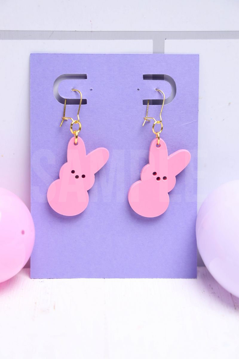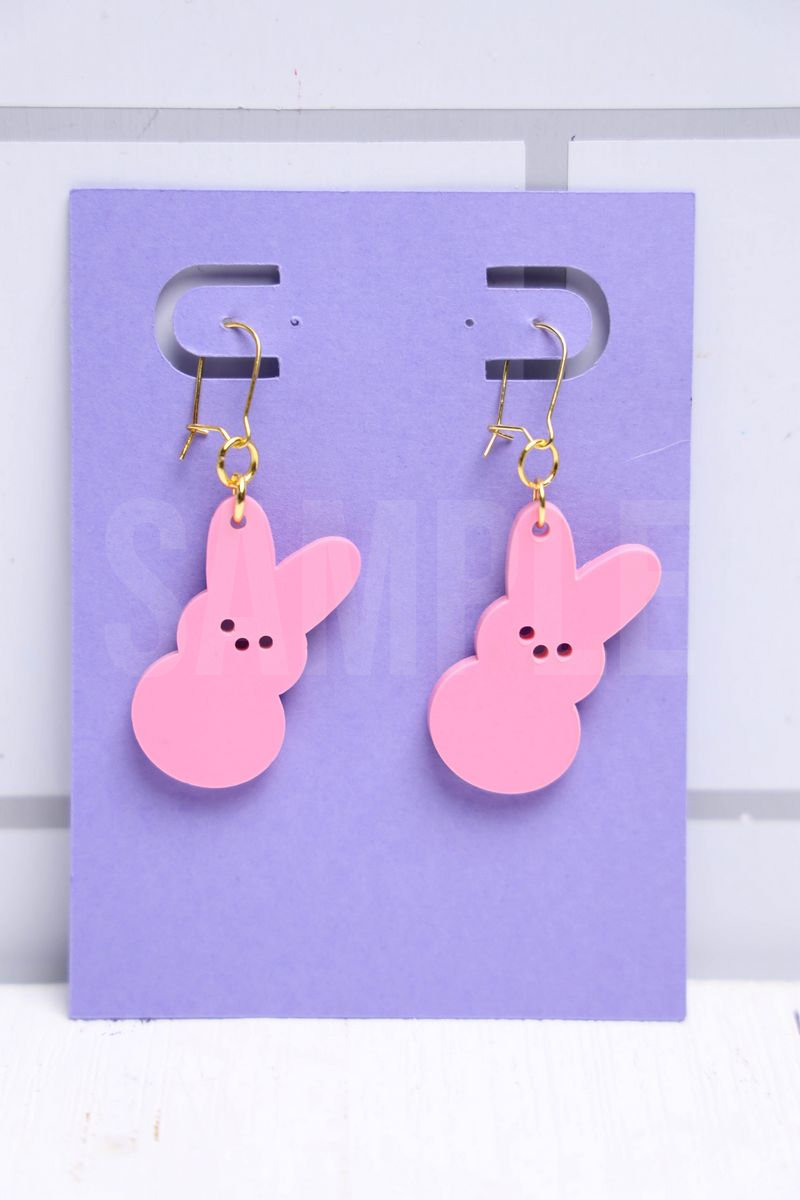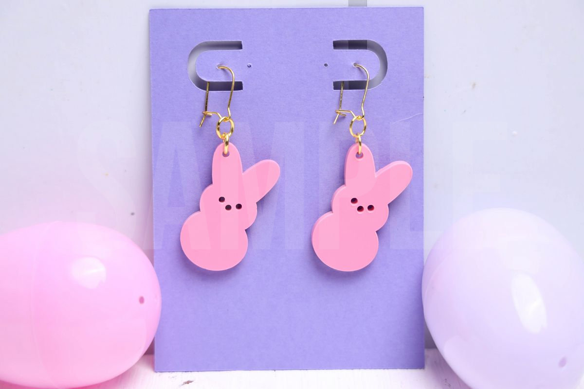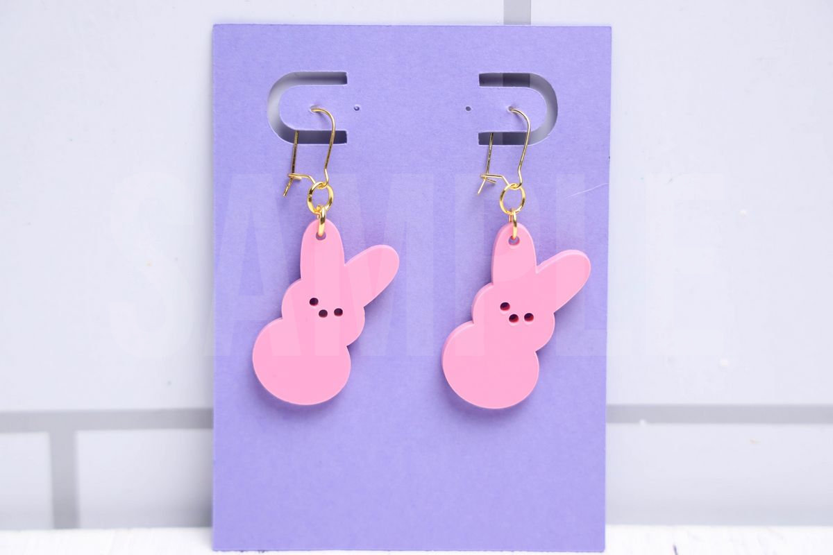 Peeps Earrings is made with acrylic, XTool P2S, and XTool Studio. This is a semi exclusive craft. The Peeps Earrings comes a purple card on white wood backdrop. Set comes with 14 in process and 20 final shots (all in process sets in semi exclusive are the same) along with SVG and tutorial in text format. Both vertical and horizontal shots are available for social media. One set of three. Sample removed on finals.