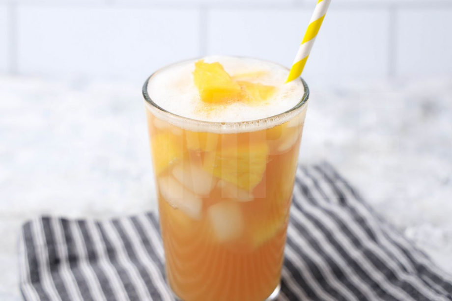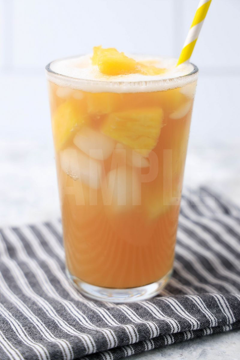 Pineapple Passionfruit Refresher is made with passionfruit tea (or juice), pineapple juice, and fresh pineapple. This is a semi exclusive recipe. The Pineapple Passionfruit Refresher comes in a clear glass with a gray striped napkin on a marble backdrop. Set comes with 9 in process (in process are the same for all sets) and 19 final shots (finals are different for each set) along with recipe in text format. Both vertical and horizontal shots are available for social media. One set of four. Sample removed on finals.
