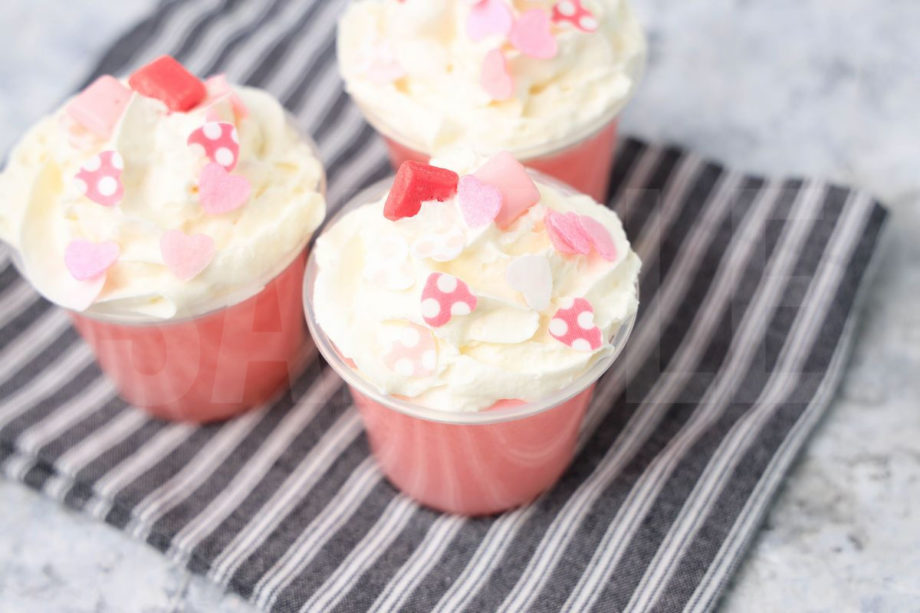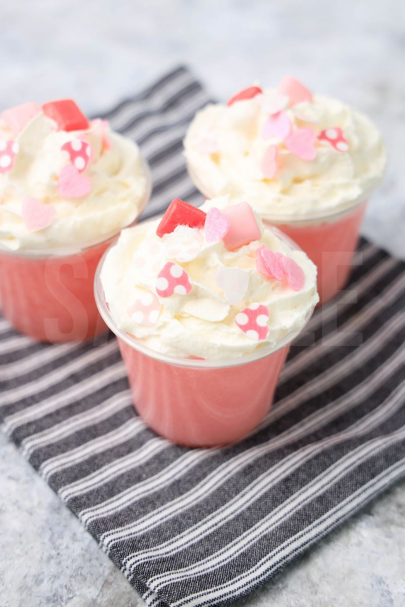 Pink Starburst Jello Shots is made with pink starburst strawberry jello mix, whipped topping, and mini Starburst candies. This is a semi exclusive recipe. Recipe written for non alcoholic and alcoholic. The Pink Starburst Jello Shots comes in clear cups on a white striped napkin with a marble backdrop. Set comes with 12 in process (in process are the same for all sets) and 19 final shots (finals are different for each set) along with recipe in text format. Both vertical and horizontal shots are available for social media. One set of four. Sample removed on finals.