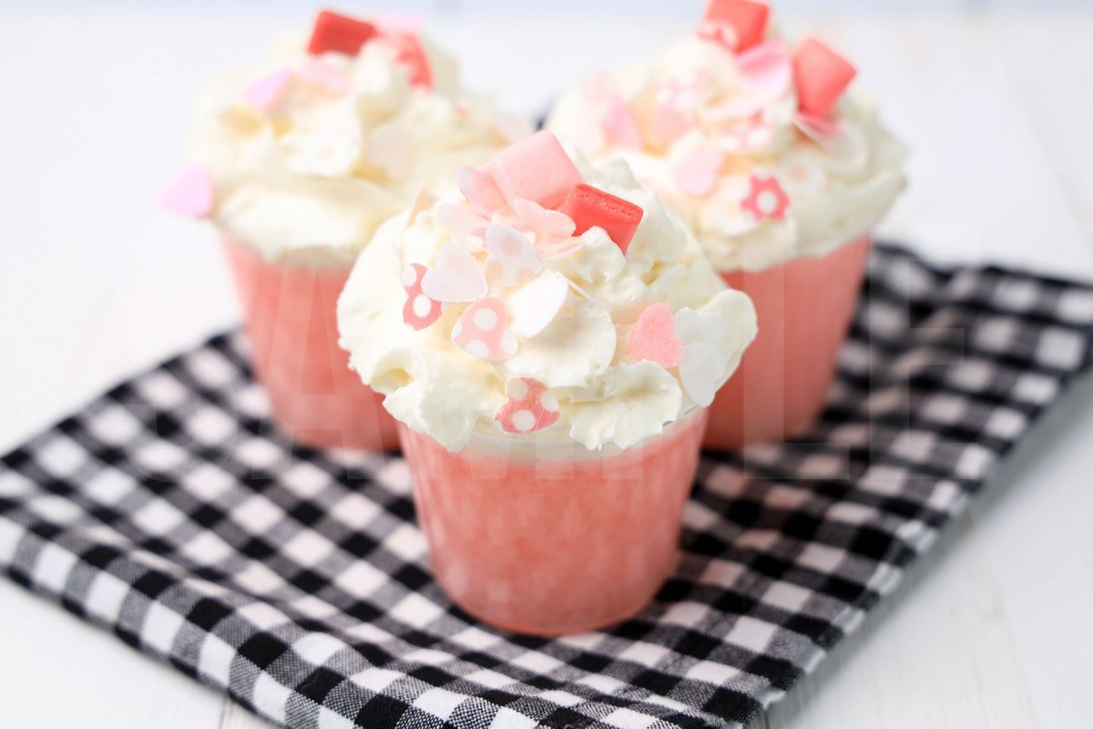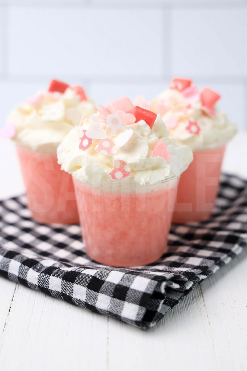 Pink Starburst Jello Shots is made with pink starburst strawberry jello mix, whipped topping, and mini Starburst candies. This is a semi exclusive recipe. Recipe written for non alcoholic and alcoholic. The Pink Starburst Jello Shots comes in clear cups on a plaid napkin with a white wood backdrop. Set comes with 12 in process (in process are the same for all sets) and 18 final shots (finals are different for each set) along with recipe in text format. Both vertical and horizontal shots are available for social media. One set of four. Sample removed on finals.