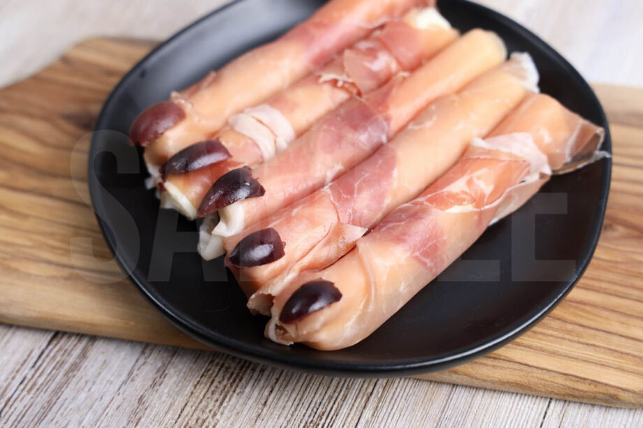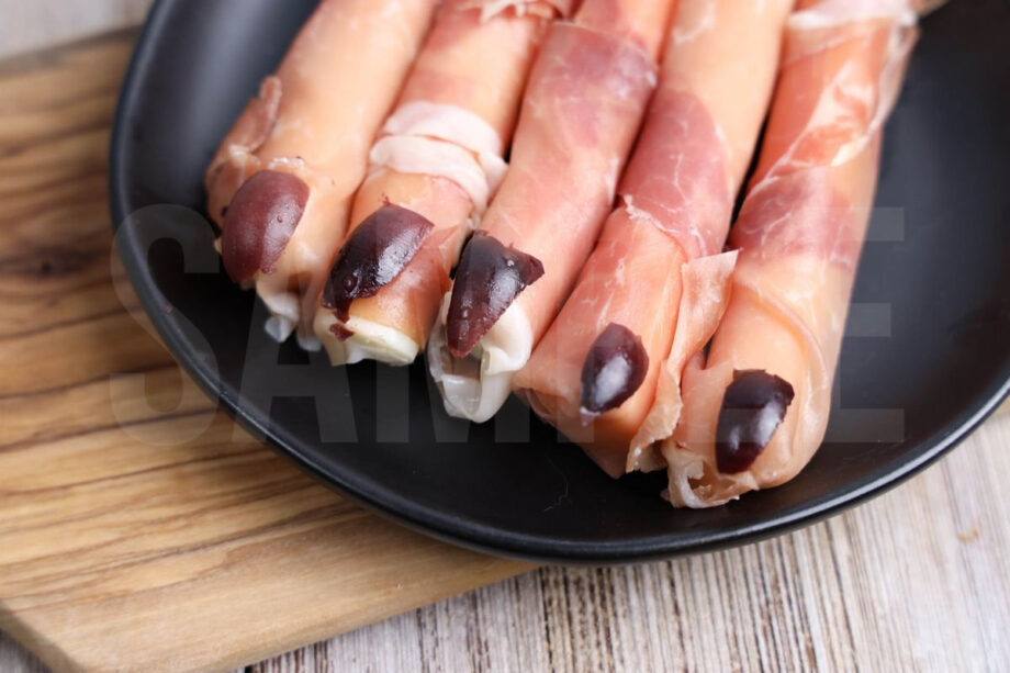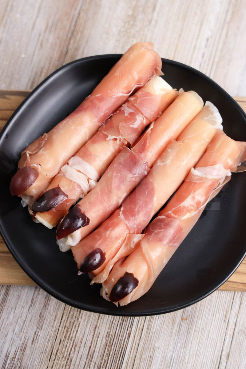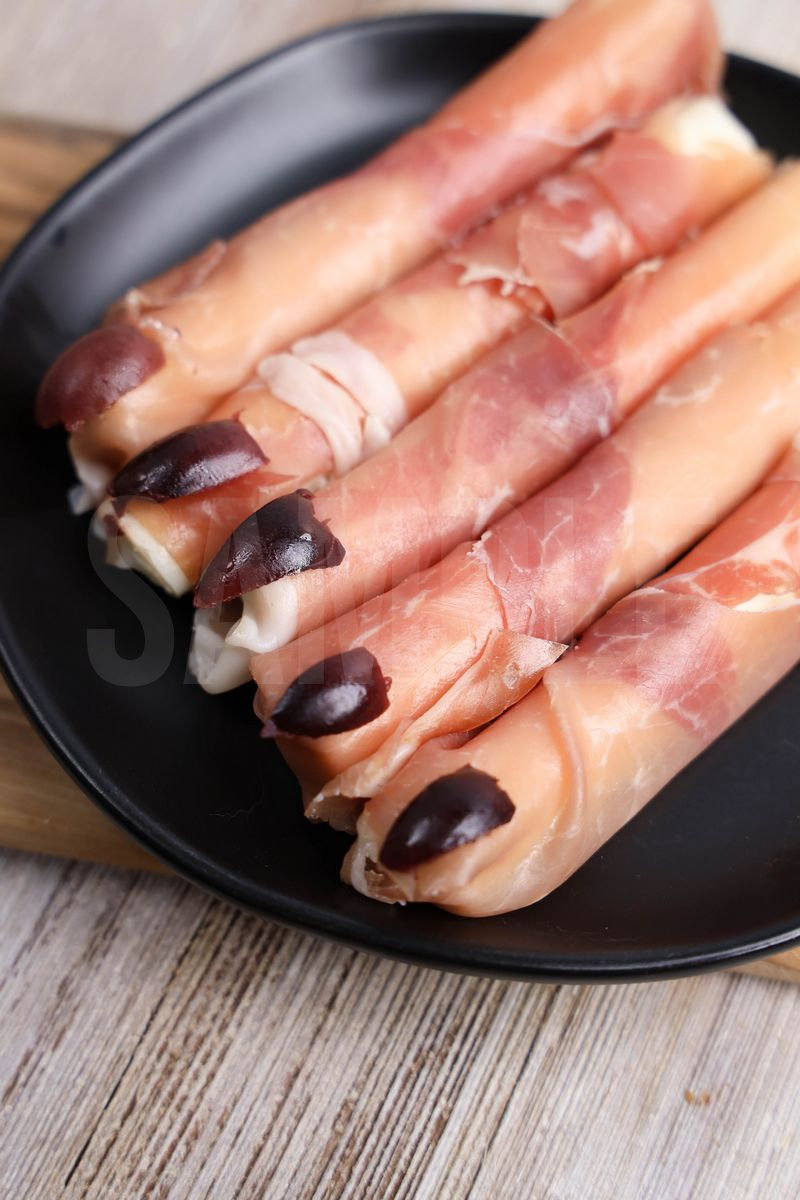 Prosciutto Witch Fingers is made with olives, prosciutto, and mozzarella cheese sticks. This is a semi exclusive recipe. The Prosciutto Witch Fingers come on a gray plate with rustic wood backdrop. Set comes with 7 in process (in process are the same for all sets) and 18 final shots (finals are different for each set) along with recipe in text format. Both vertical and horizontal shots are available for social media. One set of four. Sample removed on finals.