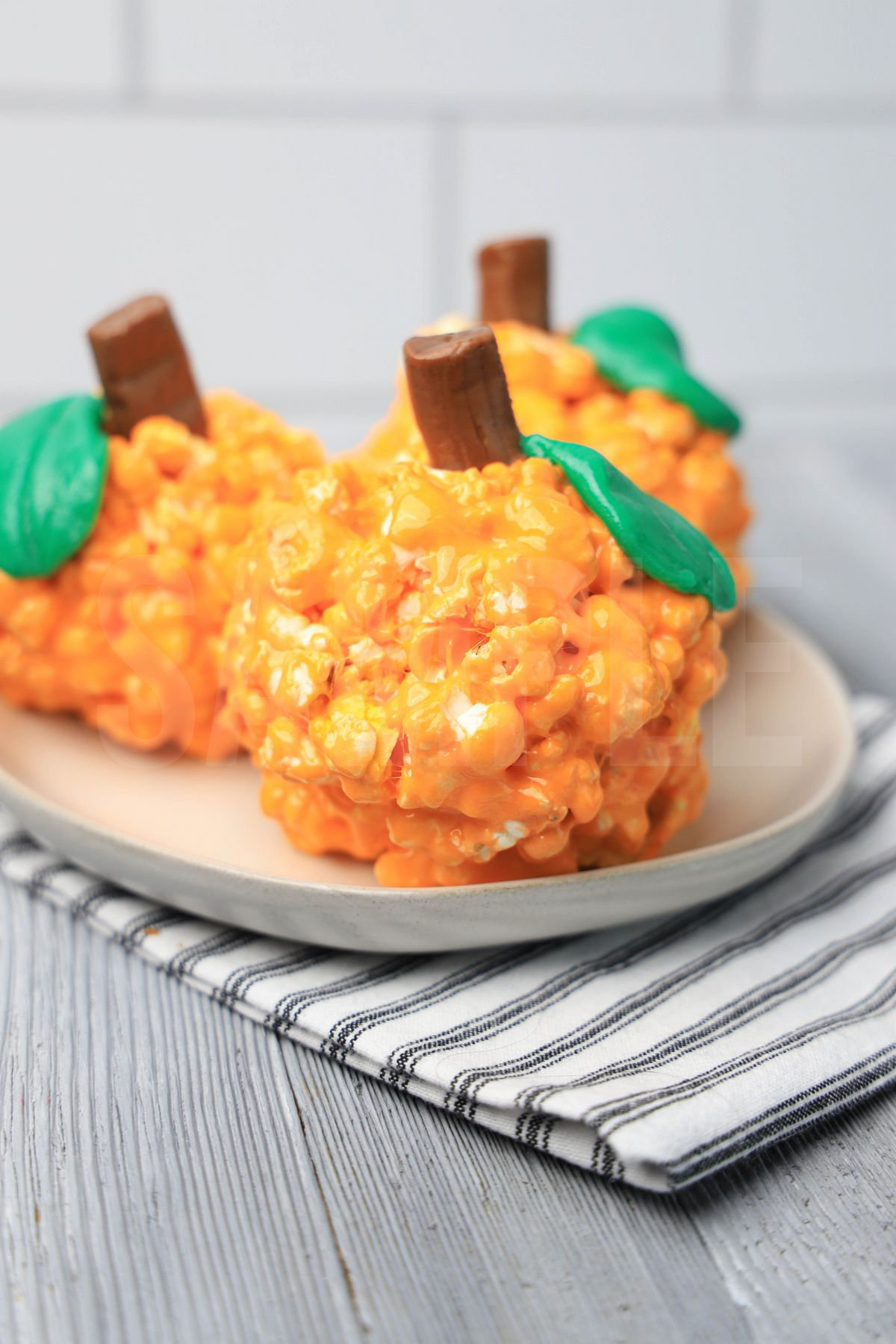 Pumpkin Popcorn Balls is made with popcorn, marshmallows, and butter. This is a semi exclusive recipe. The Pumpkin Popcorn Balls comes on a white plate with a white striped napkin on a gray wood backdrop. Set comes with 9 in process (in process are the same for all sets) and 15 final shots (finals are different for each set) along with recipe in text format. Both vertical and horizontal shots are available for social media. One set of four. Sample removed on finals.