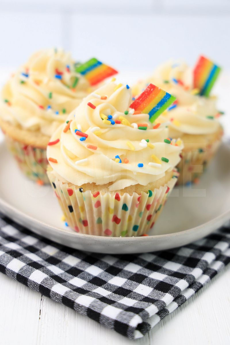 Rainbow Cupcakes is made with flour, sugar, and airhead rainbows strips. This is a semi exclusive recipe. The Rainbow Cupcakes comes on a white plate on a gray striped napkin with a marble backdrop. Set comes with 13 in process (in process are the same for all sets) and 15 final shots (finals are different for each set) along with recipe in text format. Both vertical and horizontal shots are available for social media. One set of three. Sample removed on finals.