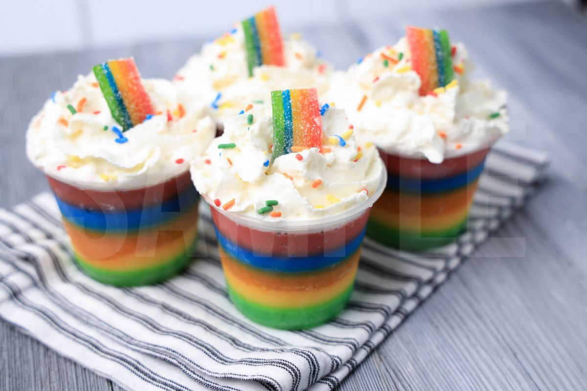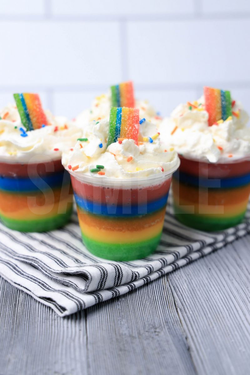 Rainbow Jello Shots is made with jello, Knox gelatin, and sweetened condensed milk. Alcohol is optional and only showed in one in process picture. This is a semi exclusive recipe. The Rainbow Jello Shots come in a clear plastic cup with a white striped napkin on a gray wood backdrop. Set comes with 24 in process (in process are the same for all sets) and 18 final shots (finals are different for each set) along with recipe in text format. Both vertical and horizontal shots are available for social media. One set of four. Sample removed on finals.