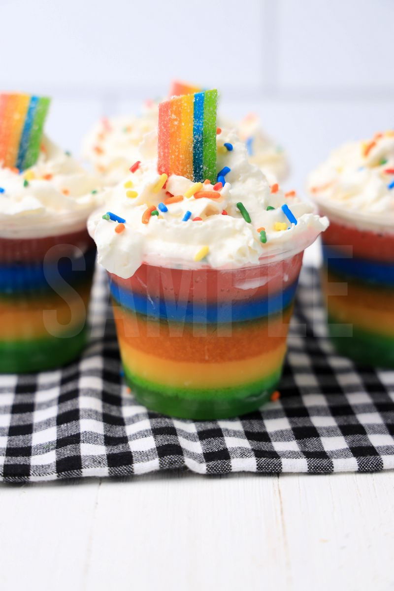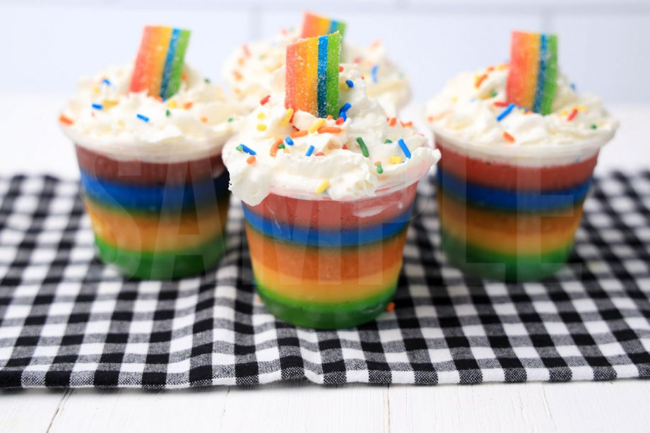 Rainbow Jello Shots is made with jello, Knox gelatin, and sweetened condensed milk. Alcohol is optional and only showed in one in process picture. This is a semi exclusive recipe. The Rainbow Jello Shots come in a clear plastic cup with a plaid napkin on a white wood backdrop. Set comes with 24 in process (in process are the same for all sets) and 17 final shots (finals are different for each set) along with recipe in text format. Both vertical and horizontal shots are available for social media. One set of four. Sample removed on finals.