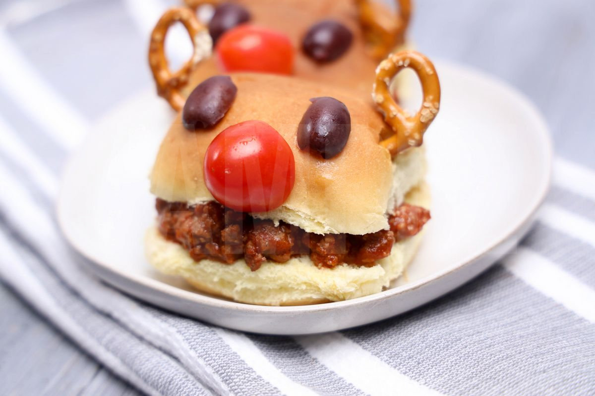 Rudolph Sloppy Joe Sliders is made with ground beef, manwich, slider rolls, pretzels, olives, and tomatoes. This is a semi exclusive recipe. The Rudolph Sloppy Joe Sliders comes on a white plate with a gray wood backdrop. Set comes with 13 in process (in process are the same for all sets) and 17 final shots (finals are different for each set) along with recipe in text format. Both vertical and horizontal shots are available for social media. One set of four. Sample removed on finals.