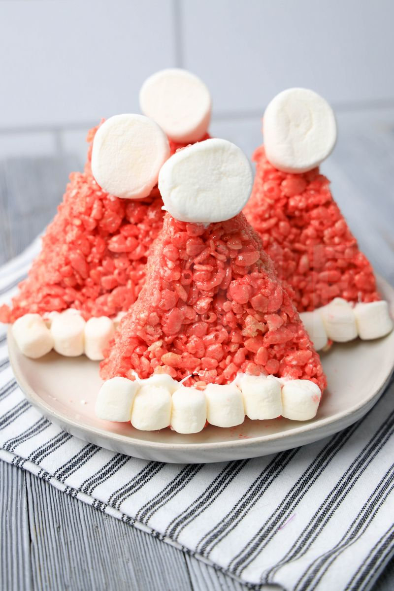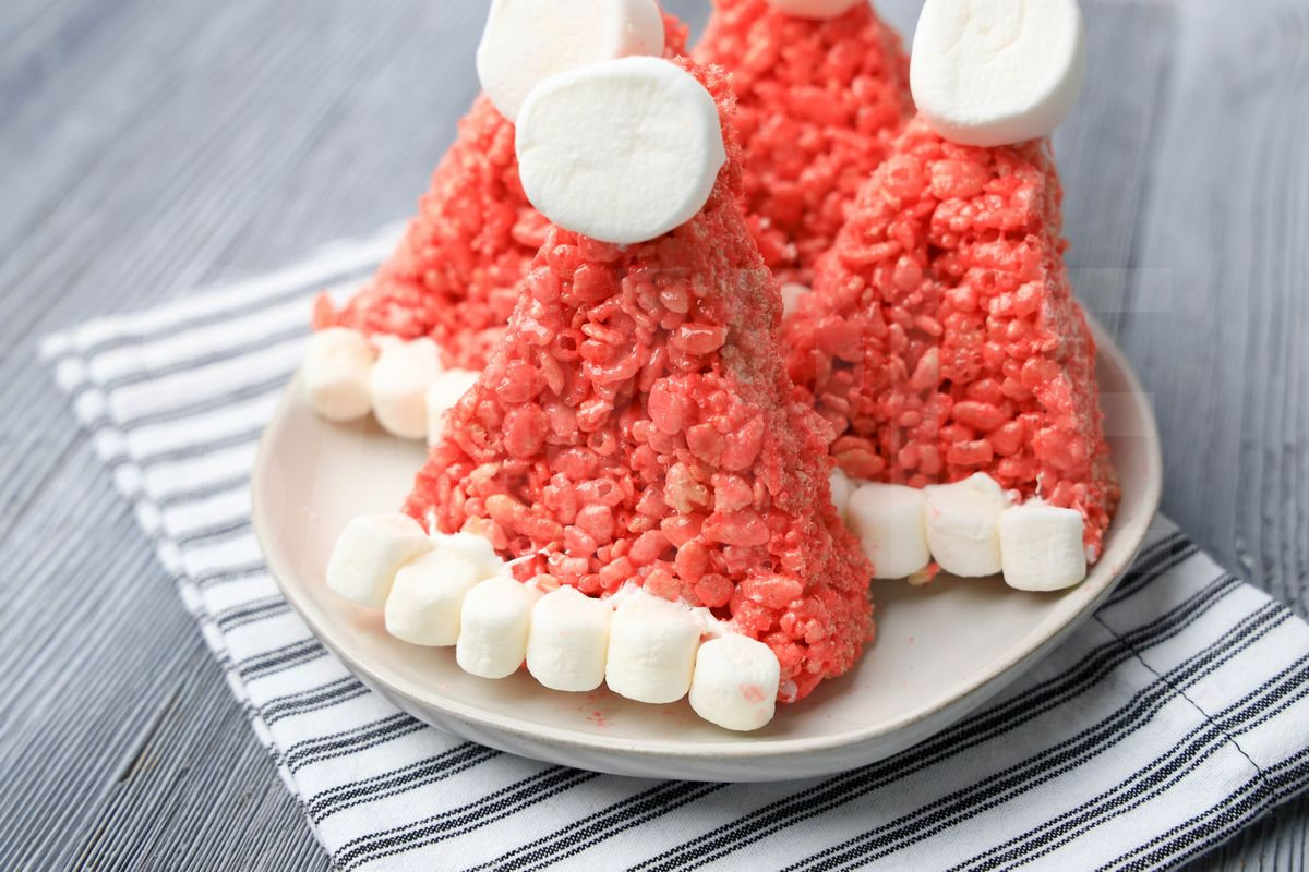 Santa Hat Rice Krispies Treats is made with rice krispies, marshmallows, and butter. This is a semi exclusive recipe. The Santa Hat Rice Krispies Treats comes on a white plate with a white striped napkin on a gray wood backdrop. Set comes with 13 in process (in process are the same for all sets) and 17 final shots (finals are different for each set) along with recipe in text format. Both vertical and horizontal shots are available for social media. One set of four. Sample removed on finals.