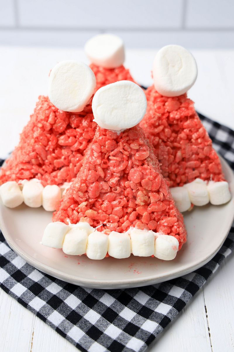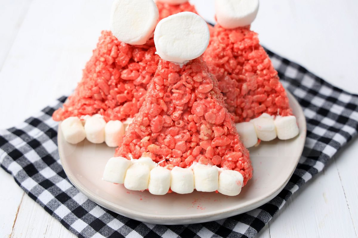 Santa Hat Rice Krispies Treats is made with rice krispies, marshmallows, and butter. This is a semi exclusive recipe. The Santa Hat Rice Krispies Treats comes on a white plate with a plaid napkin on a white wood backdrop. Set comes with 13 in process (in process are the same for all sets) and 17 final shots (finals are different for each set) along with recipe in text format. Both vertical and horizontal shots are available for social media. One set of four. Sample removed on finals.