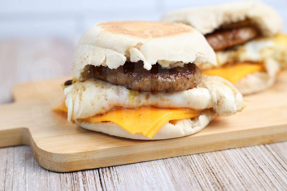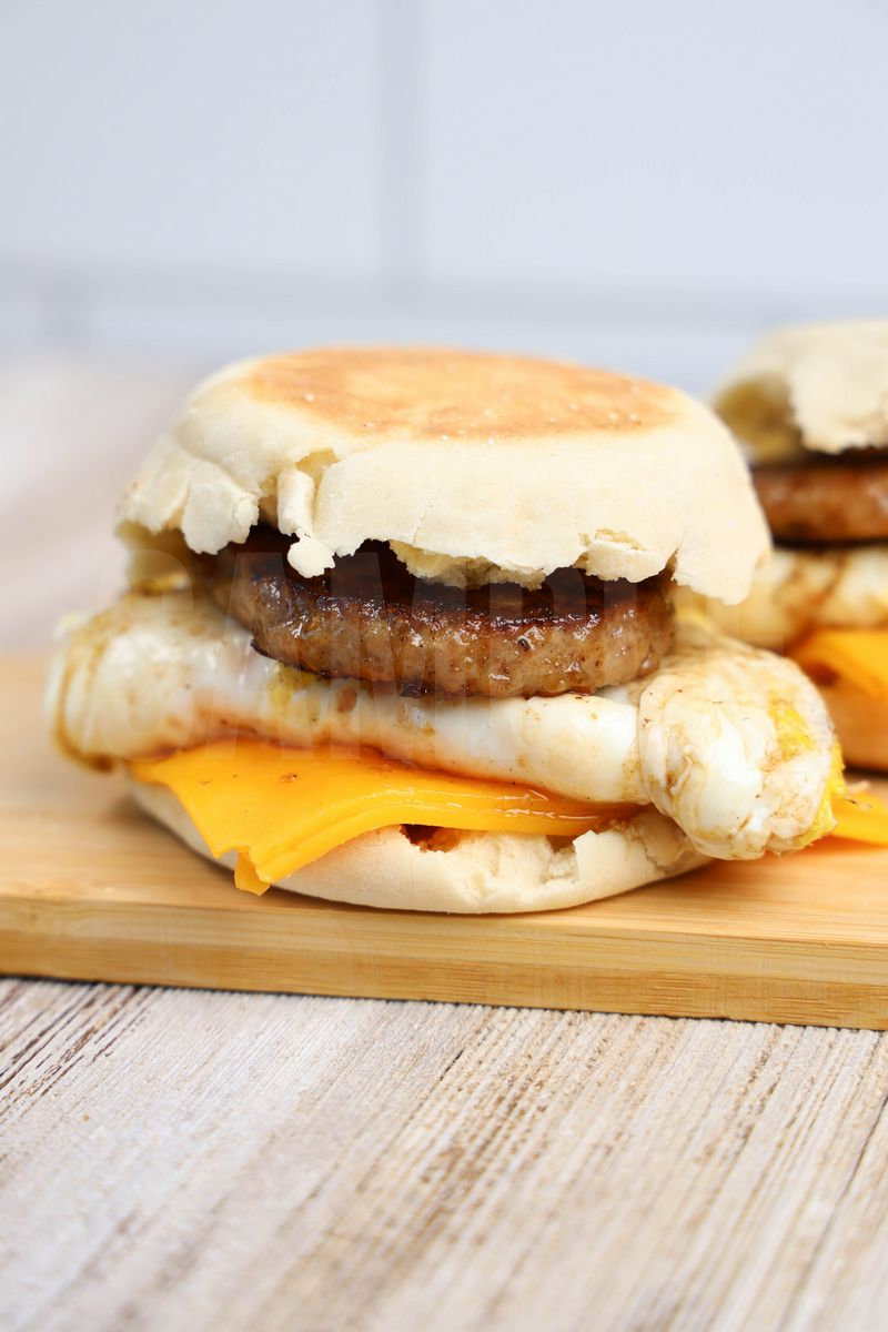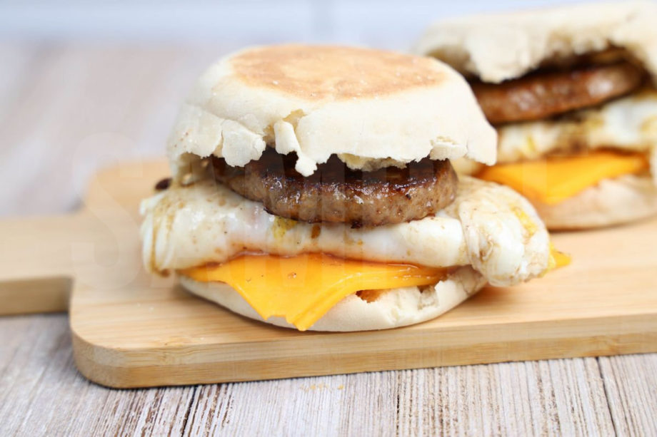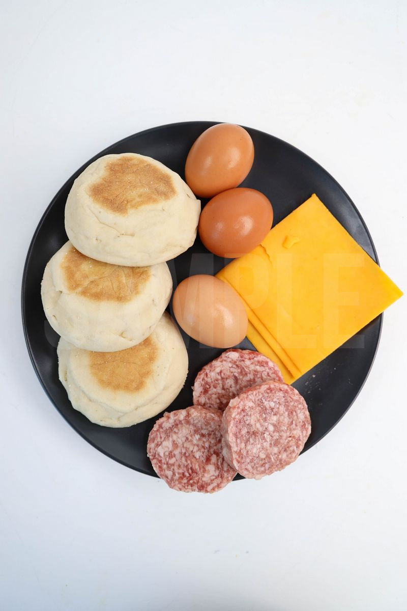 Sausage McMuffin is made with sausage, cheese, egg, and English muffin. This is a semi exclusive recipe. The Sausage McMuffin comes on a white plate with rustic wood backdrop. Set comes with 11 in process (in process are the same for all sets) and 19 final shots (finals are different for each set) along with recipe in text format. Both vertical and horizontal shots are available for social media. One set of four. Sample removed on finals.
