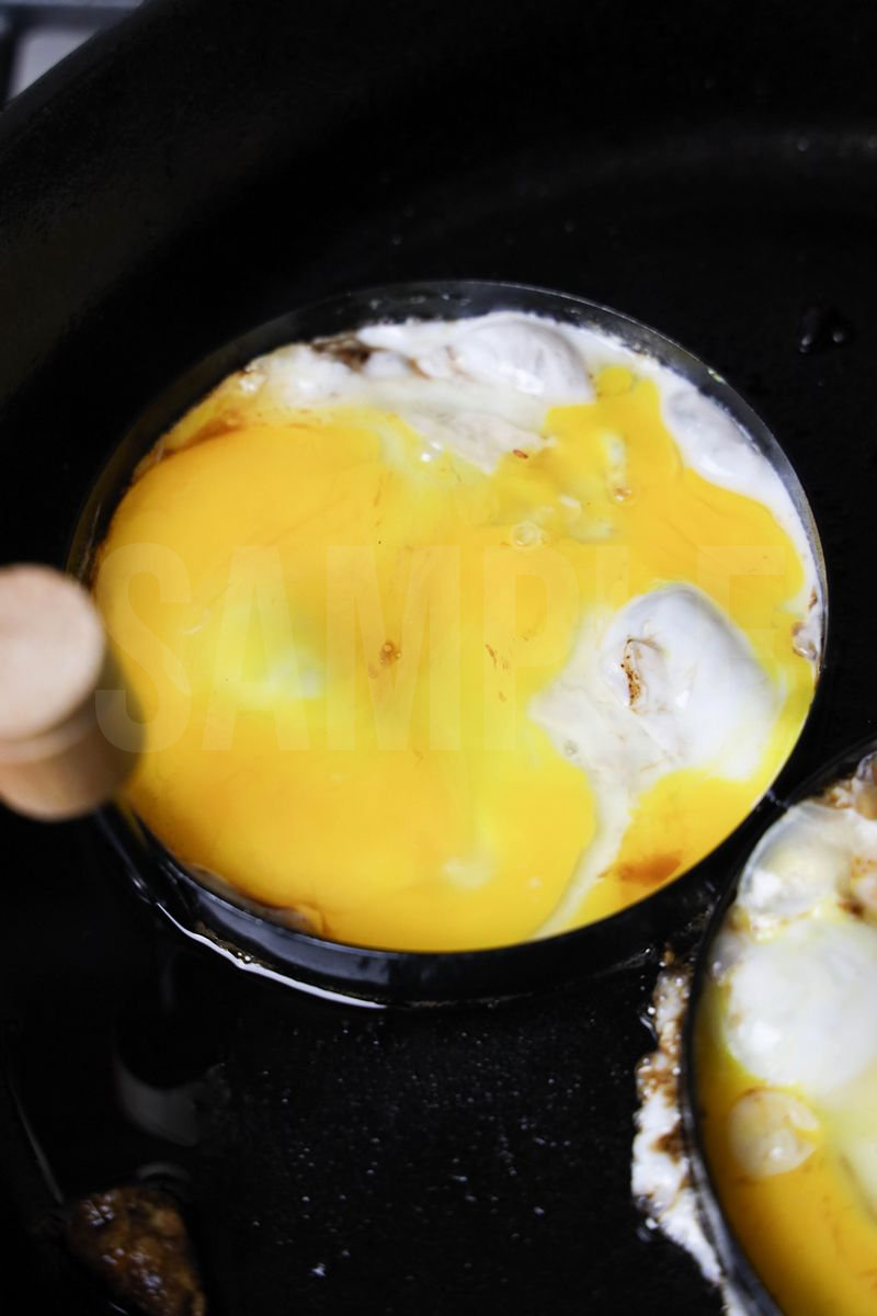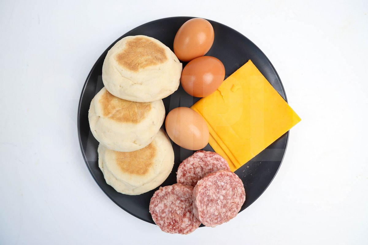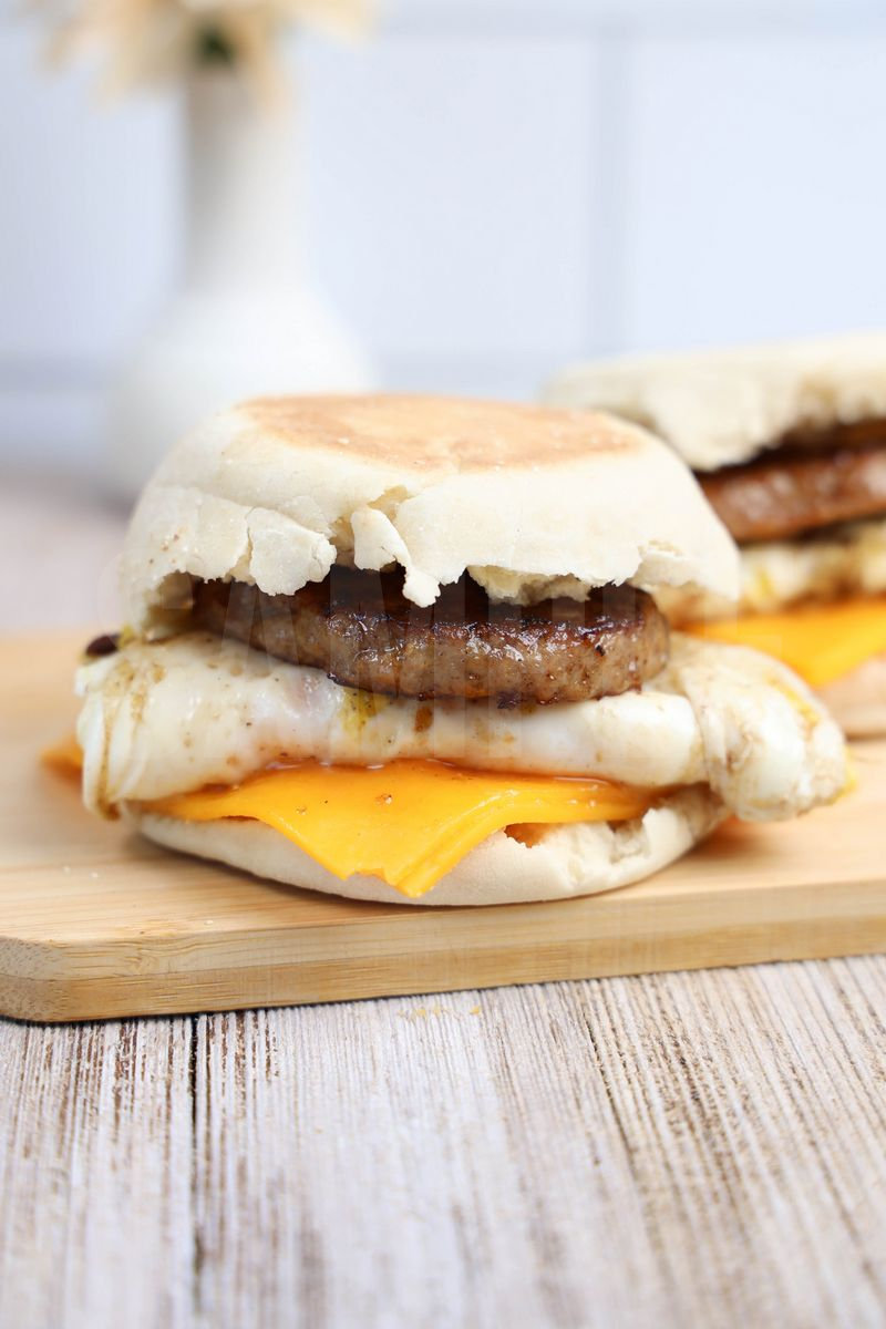 Sausage McMuffin is made with sausage, cheese, egg, and English muffin. This is a semi exclusive recipe. The Sausage McMuffin comes on a white plate with rustic wood backdrop. Set comes with 11 in process (in process are the same for all sets) and 19 final shots (finals are different for each set) along with recipe in text format. Both vertical and horizontal shots are available for social media. One set of four. Sample removed on finals.