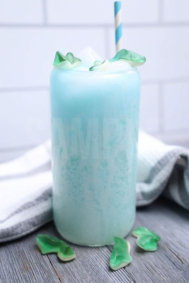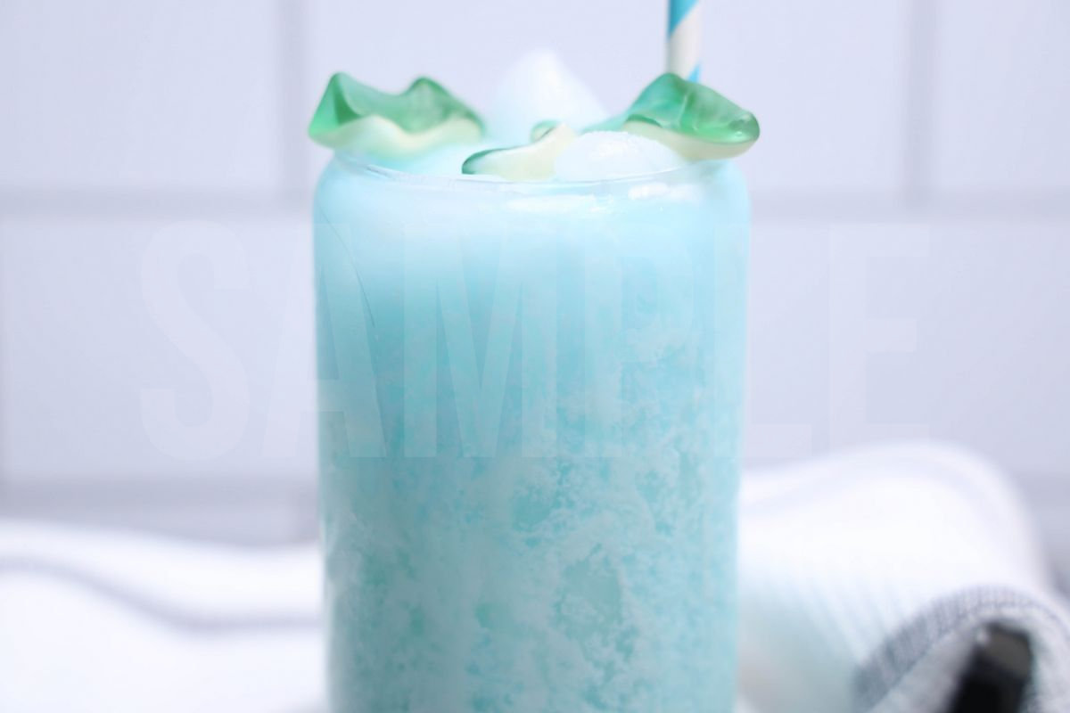 Shark Dirty Soda is made with 7-UP, blue Gatorade, gummi sharks, and coconut creamer. This is a semi exclusive recipe. The Shark Dirty Soda comes in a glass on a gray wood backdrop. Set comes with 8 in process (in process are the same for all sets) and 15 final shots (finals are different for each set) along with recipe in text format. Both vertical and horizontal shots are available for social media. One set of three. Sample removed on finals.
