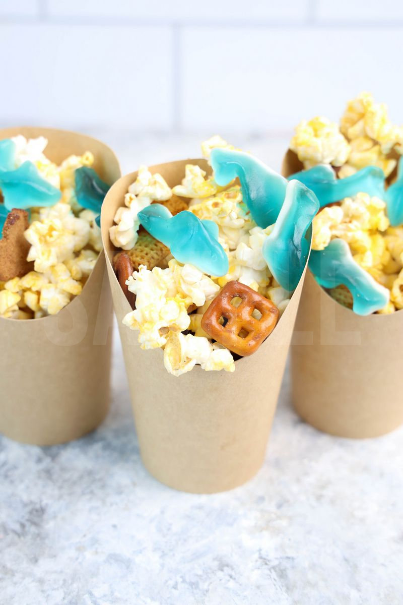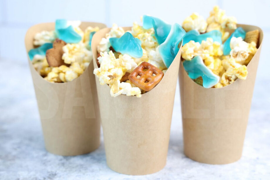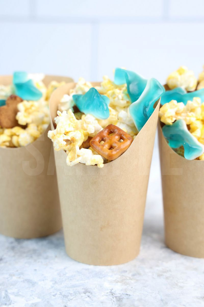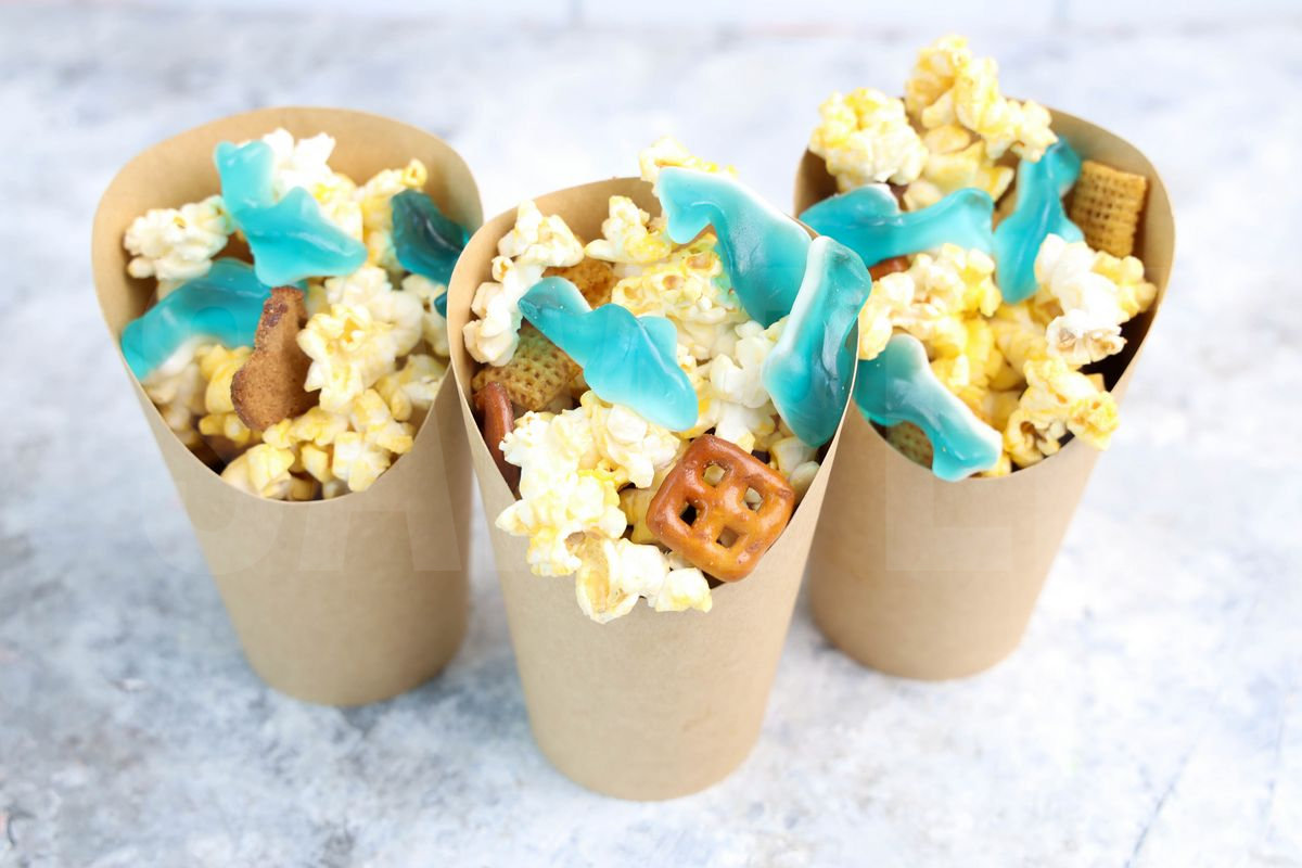 Shark Snack Cups is made with shark gummies, popcorn, and chex mix. This is a semi exclusive recipe. The Shark Snack Cups comes in a brown fry cup with marble wood backdrop. Set comes with 9 in process (in process are the same for all sets) and 17 final shots (finals are different for each set) along with recipe in text format. Both vertical and horizontal shots are available for social media. One set of four. Sample removed on finals.
