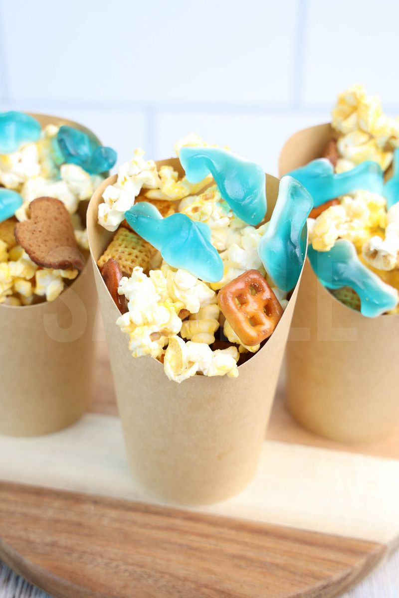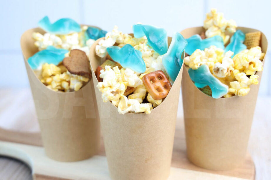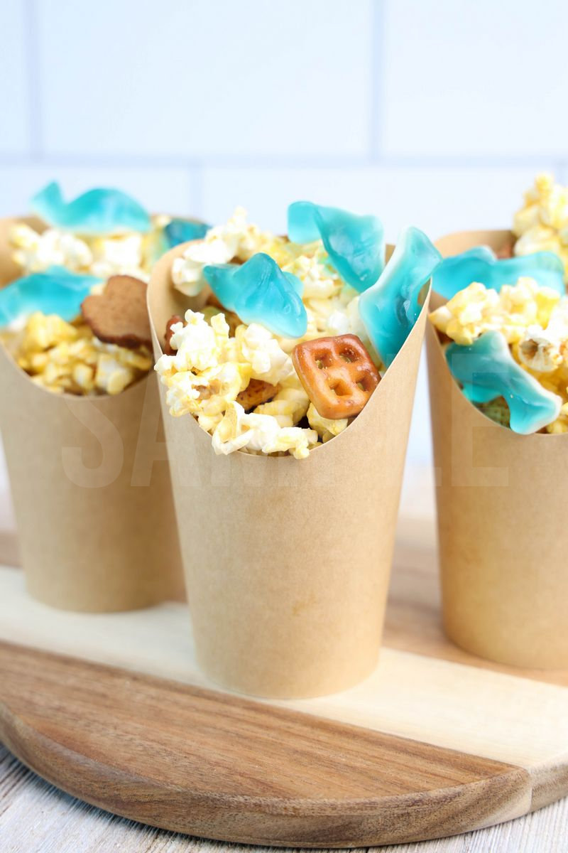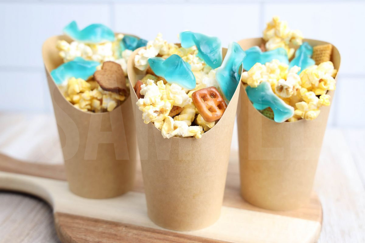 Shark Snack Cups is made with shark gummies, popcorn, and chex mix. This is a semi exclusive recipe. The Shark Snack Cups comes in a brown fry cup with rustic wood backdrop. Set comes with 9 in process (in process are the same for all sets) and 21 final shots (finals are different for each set) along with recipe in text format. Both vertical and horizontal shots are available for social media. One set of four. Sample removed on finals.