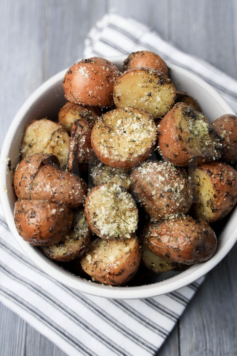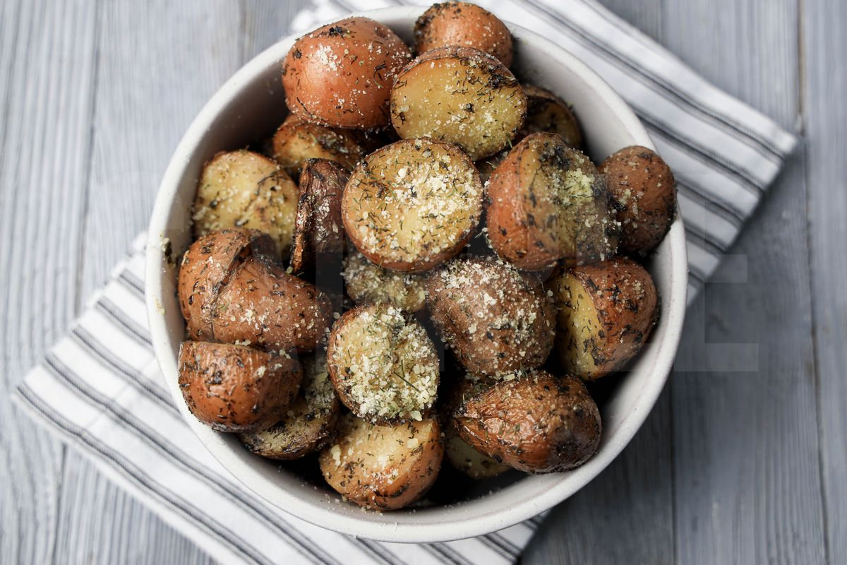 Slow Cooker Roasted Parmesan Herb Potatoes is made with red potatoes, dill, and parmesan. This is a semi exclusive recipe. The Slow Cooker Roasted Parmesan Herb Potatoes comes in a white bowl with a white striped napkin on a gray wood backdrop. Set comes with 7 in process (in process are the same for all sets) and 16 final shots (finals are different for each set) along with recipe in text format. Both vertical and horizontal shots are available for social media. One set of four. Sample removed on finals.