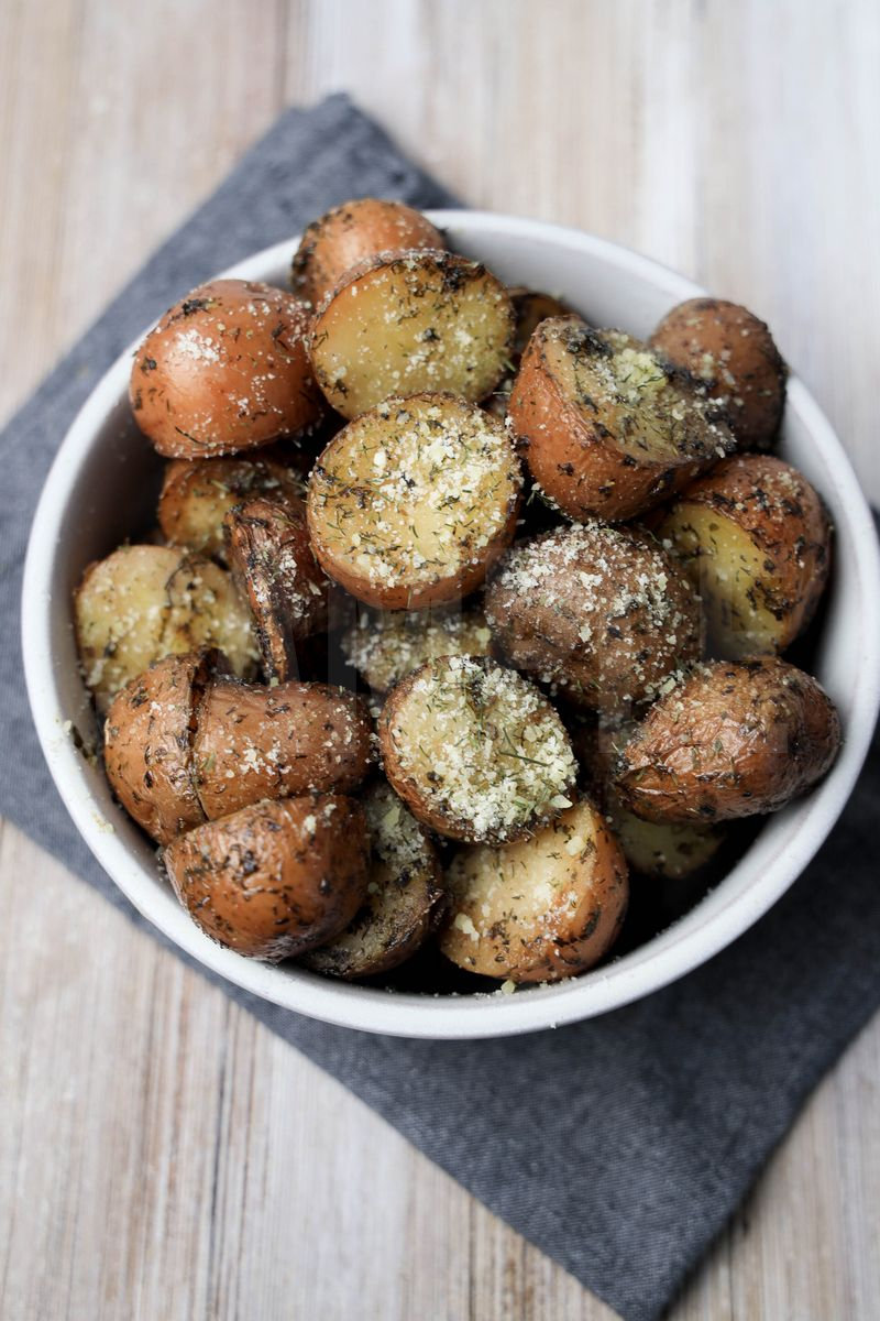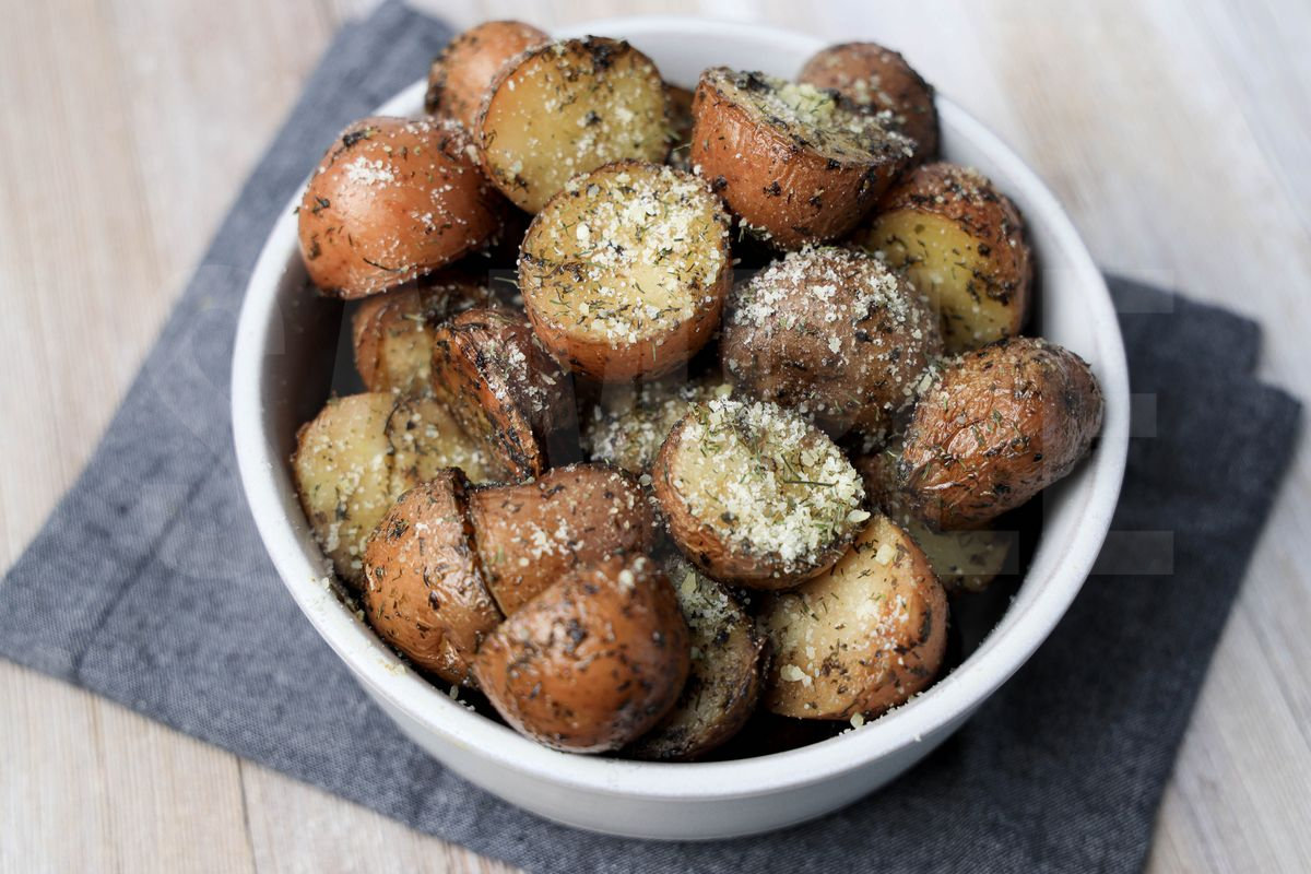 Slow Cooker Roasted Parmesan Herb Potatoes is made with red potatoes, dill, and parmesan. This is a semi exclusive recipe. The Slow Cooker Roasted Parmesan Herb Potatoes comes in a white bowl with a denim napkin on a rustic wood backdrop. Set comes with 7 in process (in process are the same for all sets) and 15 final shots (finals are different for each set) along with recipe in text format. Both vertical and horizontal shots are available for social media. One set of four. Sample removed on finals.