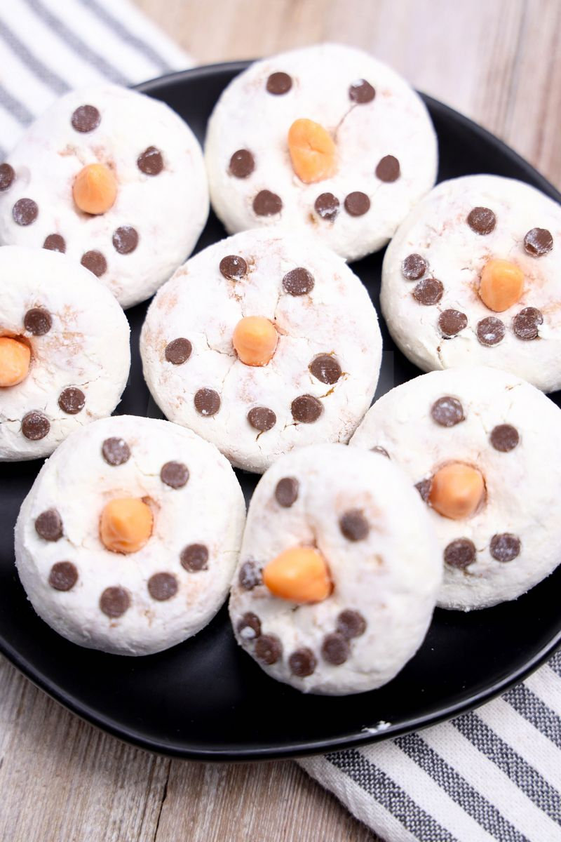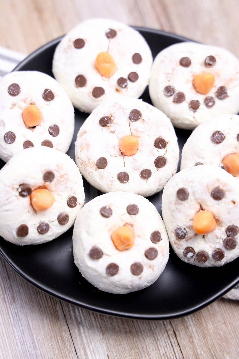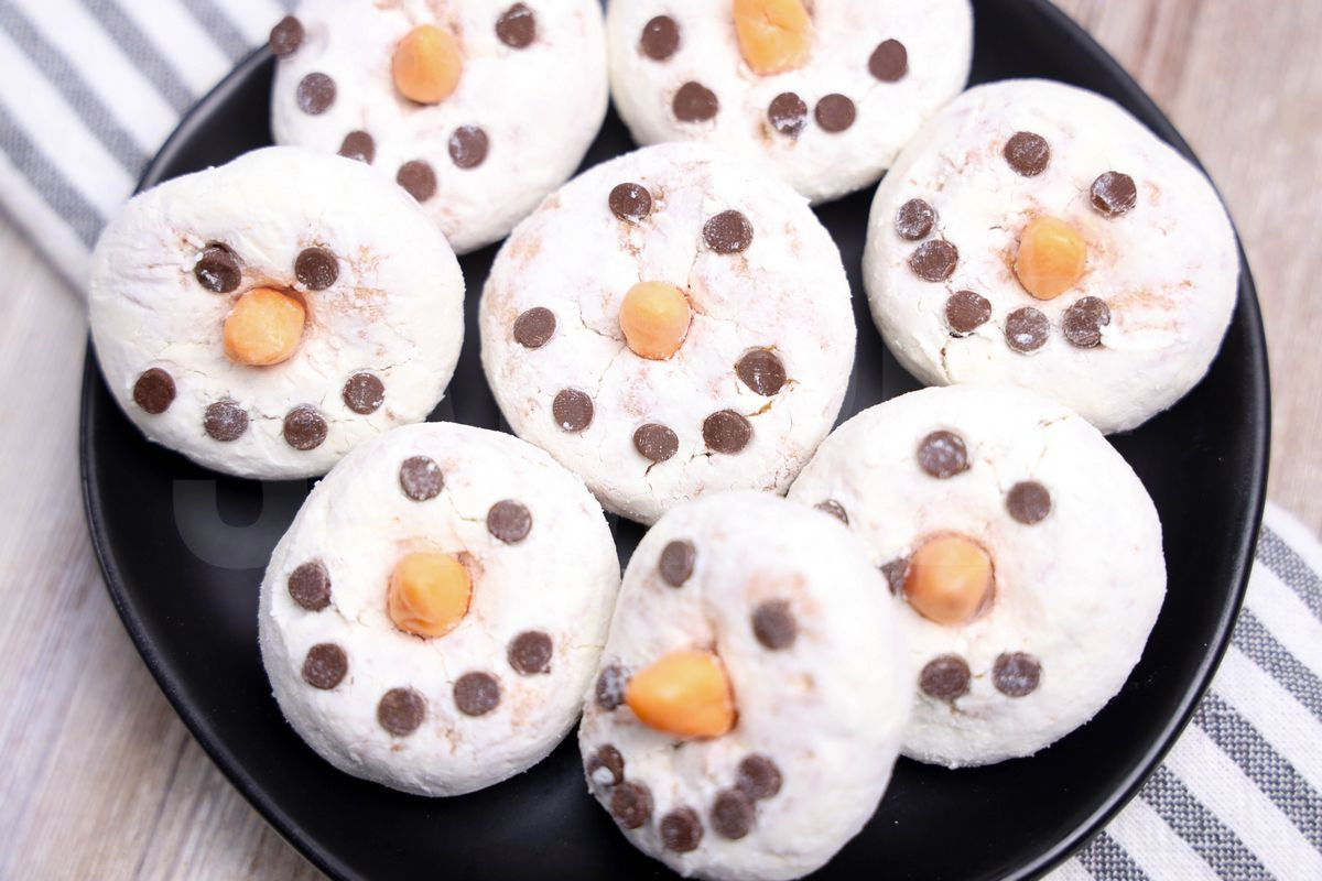 Snowman Mini Donuts is made with mini chocolate chips, mini powdered donuts, and orange starbursts. This is a semi exclusive recipe. The Snowman Mini Donuts comes on a black plate with a rustic wood backdrop. Set comes with 10 in process (in process are the same for all sets) and 16 final shots (finals are different for each set) along with recipe in text format. Both vertical and horizontal shots are available for social media. One set of four. Sample removed on finals.