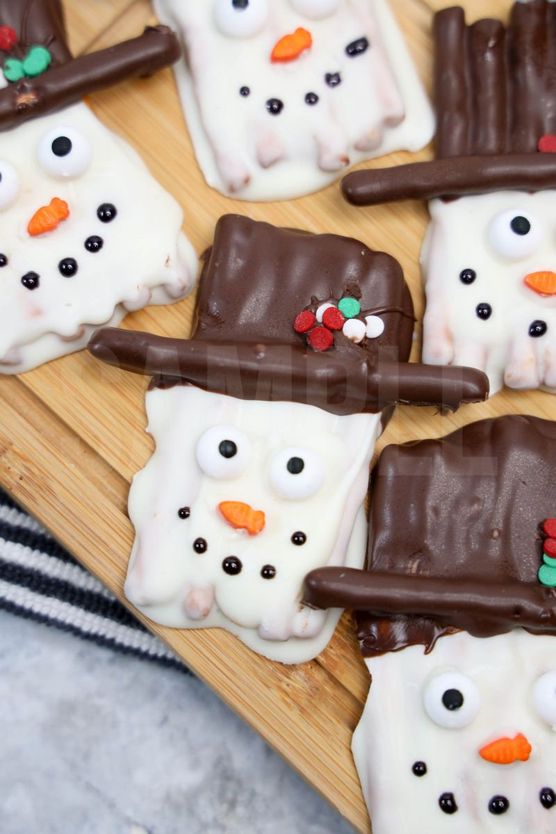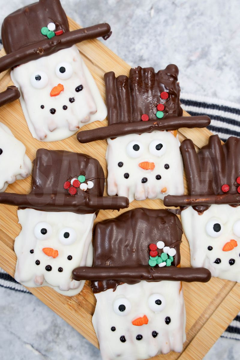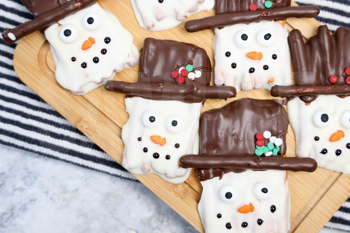 Snowman Pretzels is made with pretzels, white chocolate wafers, dark chocolate wafers, candy eyes, carrot sprinkles, and black sparkle gel. This is a semi exclusive recipe. The Snowman Pretzels comes on a cutting board with marble wood backdrop. Set comes with 9 in process (in process are the same for all sets) and 16 final shots (finals are different for each set) along with recipe in text format. Both vertical and horizontal shots are available for social media. One set of four. Sample removed on finals.