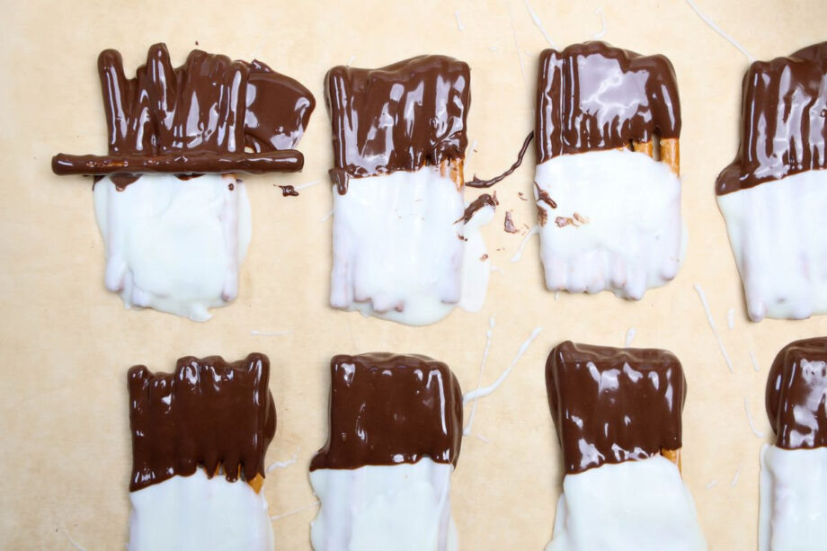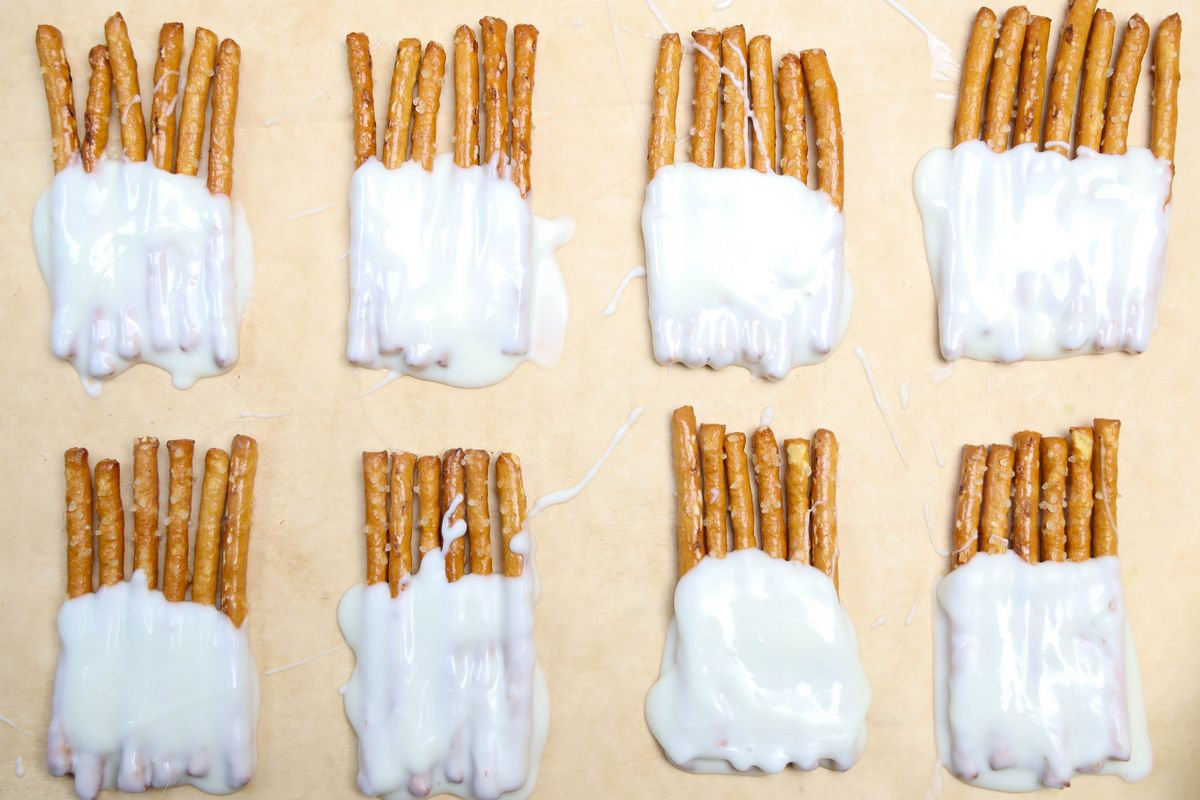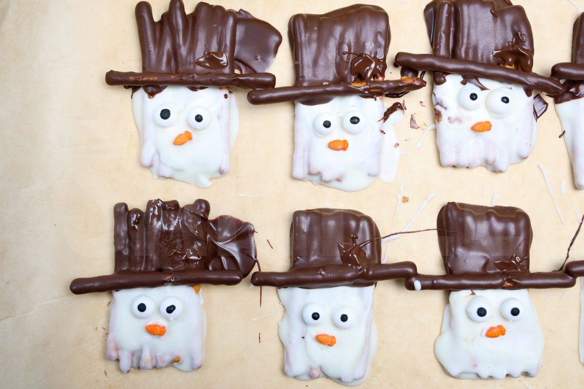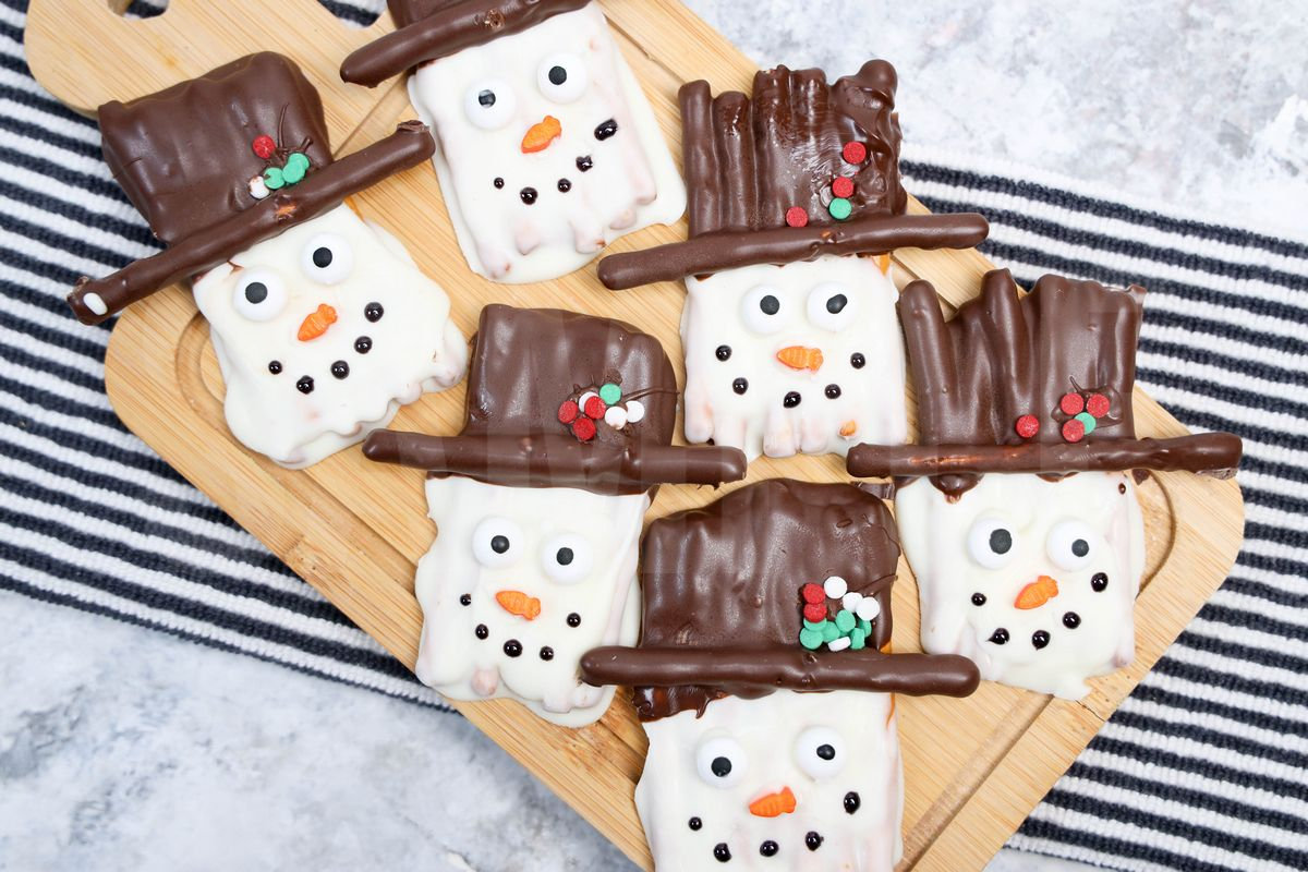 Snowman Pretzels is made with pretzels, white chocolate wafers, dark chocolate wafers, candy eyes, carrot sprinkles, and black sparkle gel. This is a semi exclusive recipe. The Snowman Pretzels comes on a cutting board with marble wood backdrop. Set comes with 9 in process (in process are the same for all sets) and 16 final shots (finals are different for each set) along with recipe in text format. Both vertical and horizontal shots are available for social media. One set of four. Sample removed on finals.