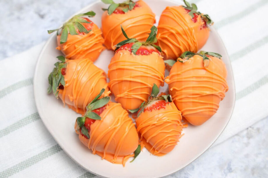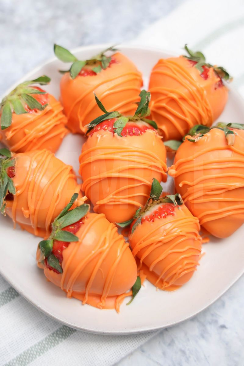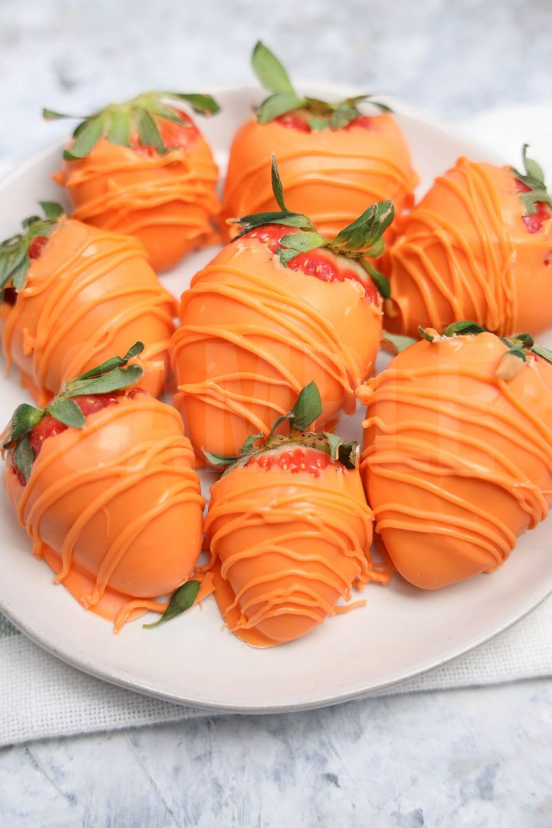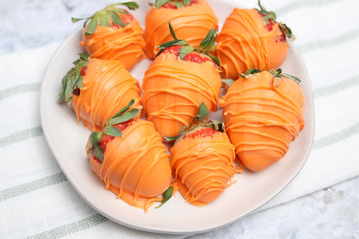 Strawberry Covered Carrots is made with orange candy melts and strawberries. This is a semi exclusive recipe. The Strawberry Covered Carrots comes in a white plate on a marble wood backdrop. Set comes with 14 in process (in process are the same for all sets) and 16 final shots (finals are different for each set) along with recipe in text format. Both vertical and horizontal shots are available for social media. One set of four. Sample removed on finals.