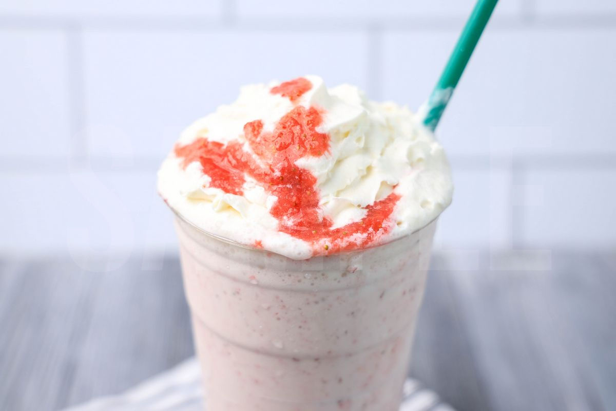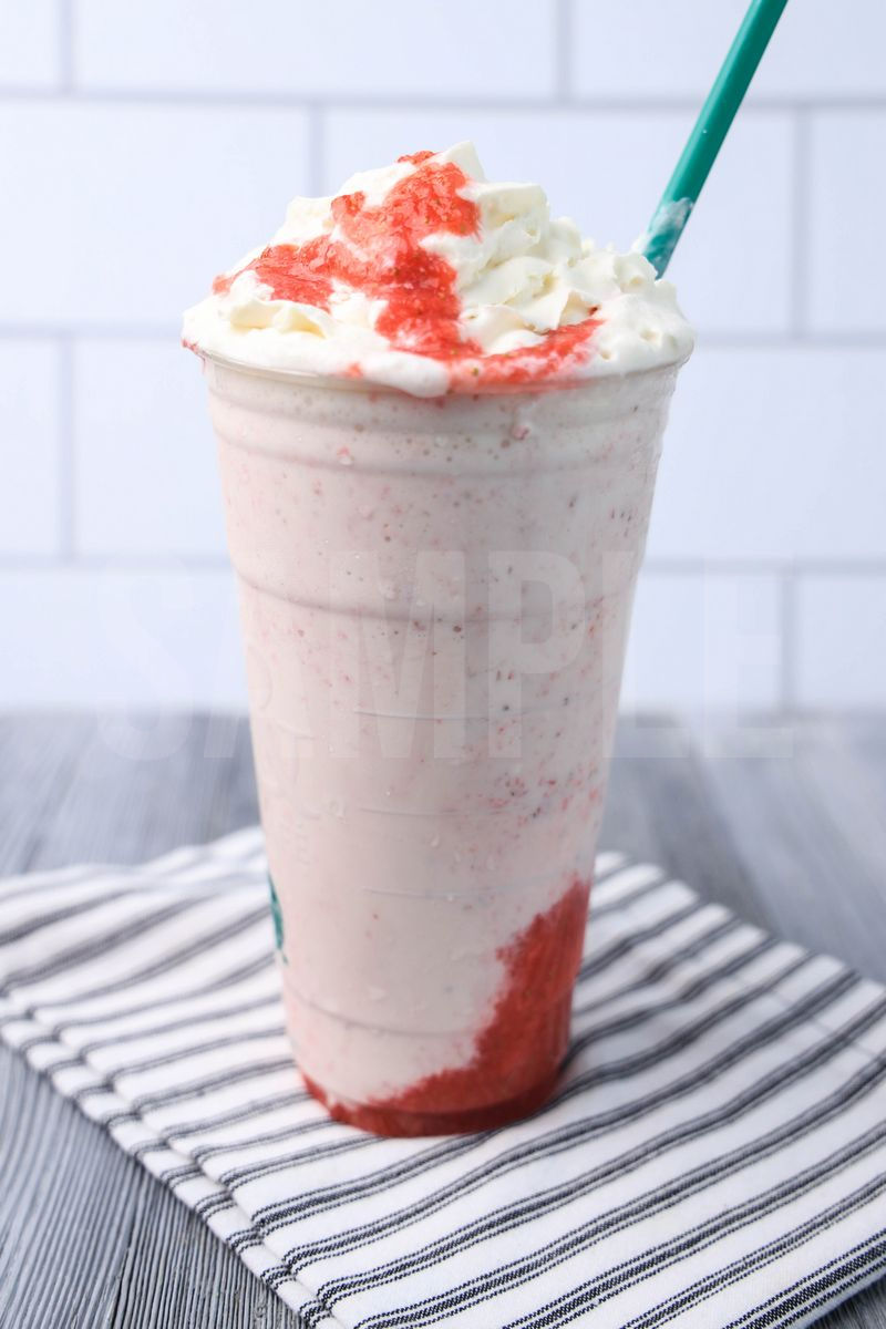 Strawberry Crème Frappuccino is made with fresh strawberries, heavy whipping cream, and ice. This is a semi exclusive recipe. The Strawberry Crème Frappuccino comes in a venti cup with a white striped napkin on a gray wood backdrop. Set comes with 9 in process (in process are the same for all sets) and 15 final shots (finals are different for each set) along with recipe in text format. Both vertical and horizontal shots are available for social media. One set of four. Sample removed on finals.