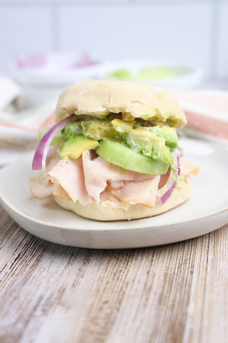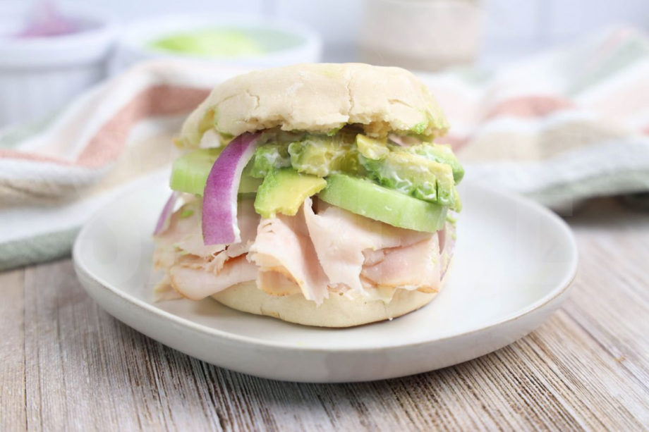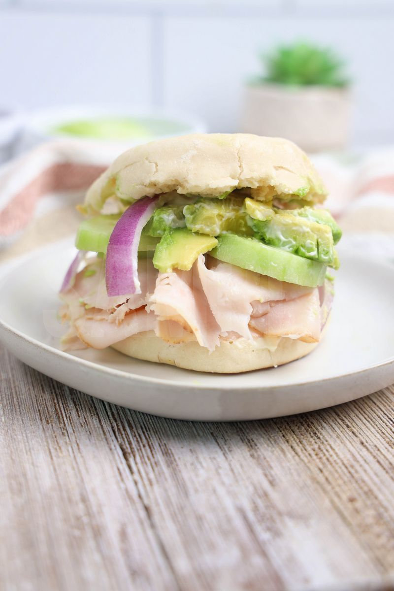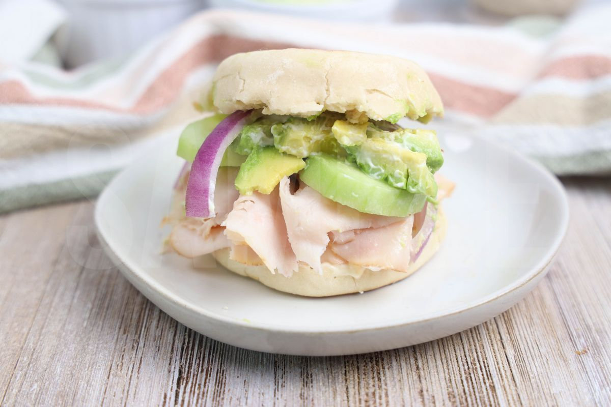Turkey Breakfast Sandwich is made with turkey, avocado, cucumber, mayo, red onion, and English muffin. This is a semi exclusive recipe. The Turkey Breakfast Sandwich comes on a white plate with a rainbow napkin on a rustic wood backdrop. Set comes with 11 in process (in process are the same for all sets) and 24 final shots (finals are different for each set) along with recipe in text format. Both vertical and horizontal shots are available for social media. One set of four. Sample removed on finals.