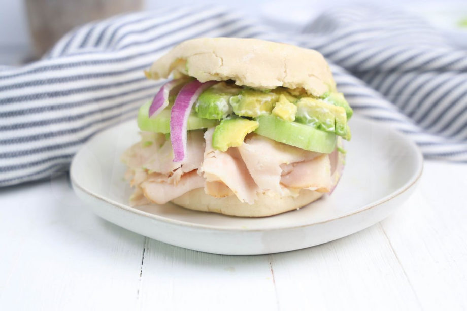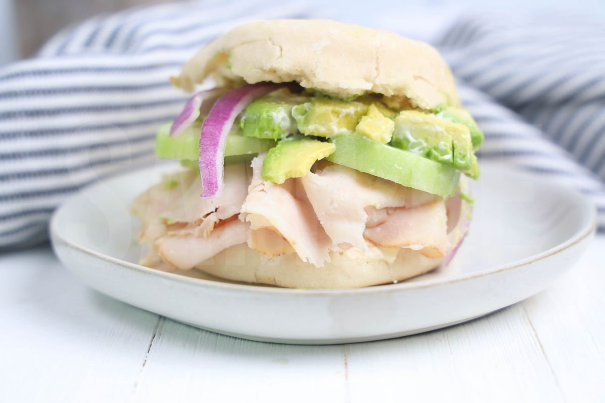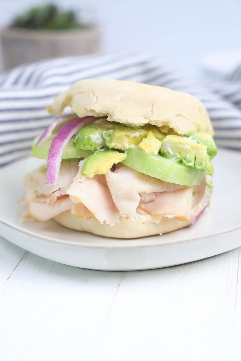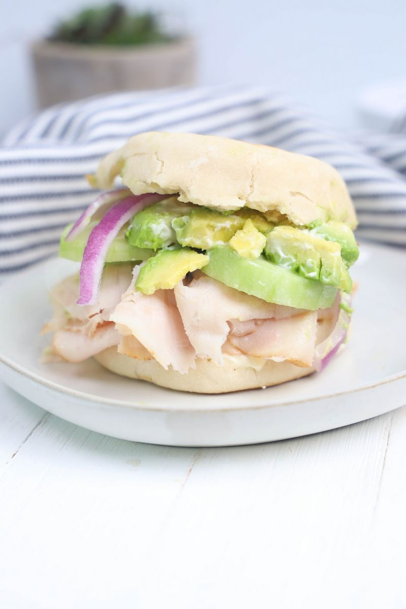 Turkey Breakfast Sandwich is made with turkey, avocado, cucumber, mayo, red onion, and English muffin. This is a semi exclusive recipe. The Turkey Breakfast Sandwich comes on a white plate with a gray and white striped napkin on a white wood backdrop. Set comes with 11 in process (in process are the same for all sets) and 25 final shots (finals are different for each set) along with recipe in text format. Both vertical and horizontal shots are available for social media. One set of four. Sample removed on finals.