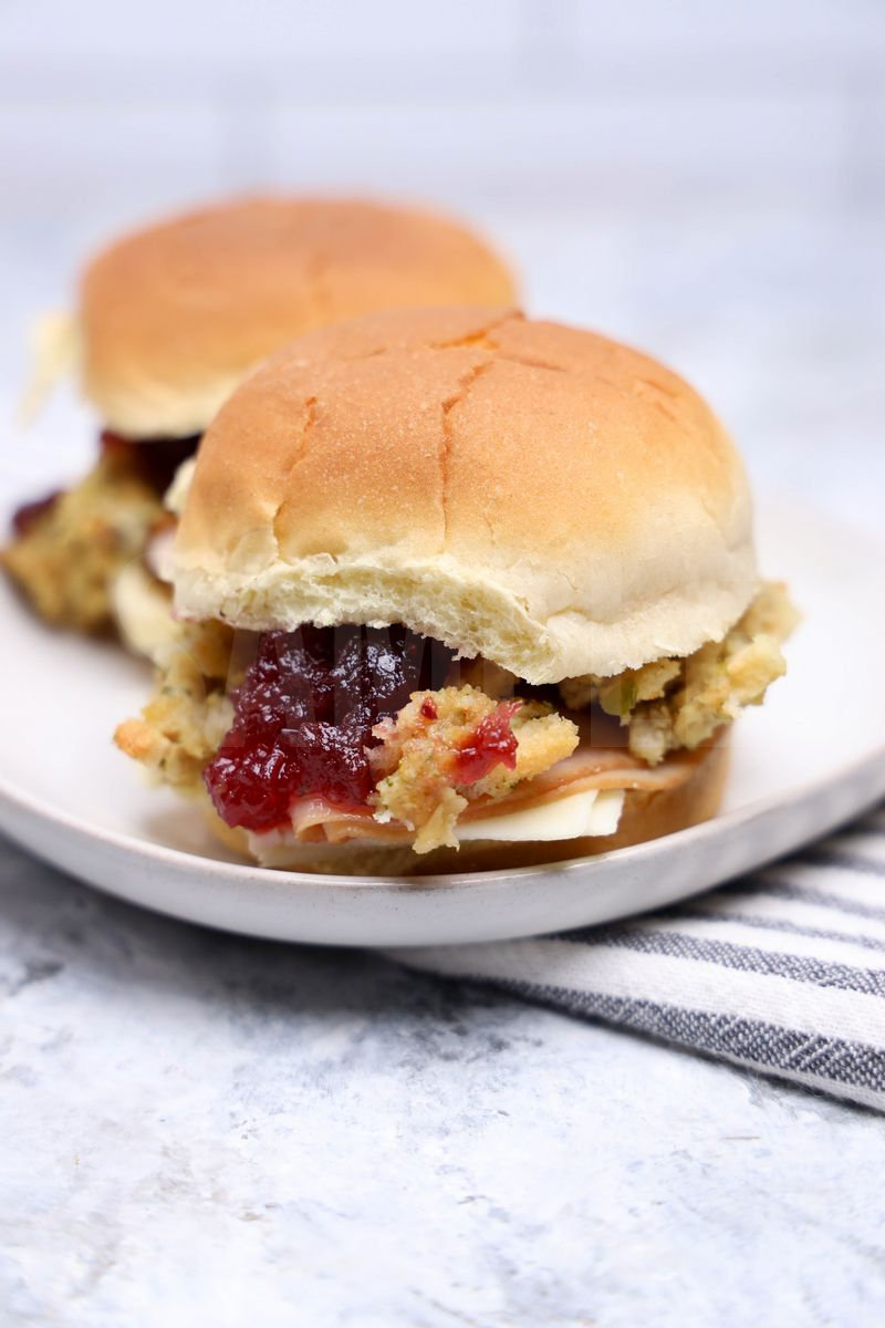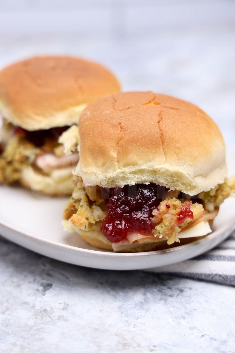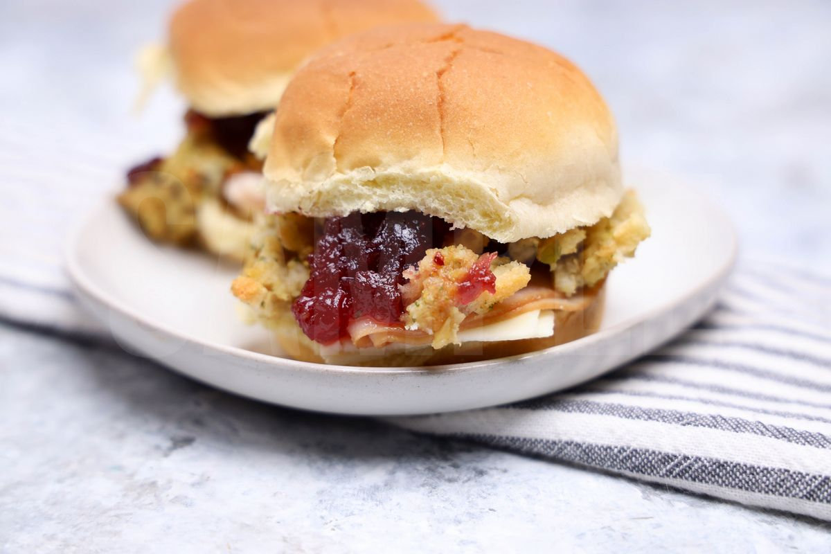 Turkey Cranberry Stuffing Sliders is made with turkey, cranberry, slider rolls, stuffing, and havarti cheese. This is a semi exclusive recipe. The Turkey Cranberry Stuffing Sliders comes on a white plate with a marble wood backdrop. Set comes with 12 in process (in process are the same for all sets) and 19 final shots (finals are different for each set) along with recipe in text format. Both vertical and horizontal shots are available for social media. One set of four. Sample removed on finals.