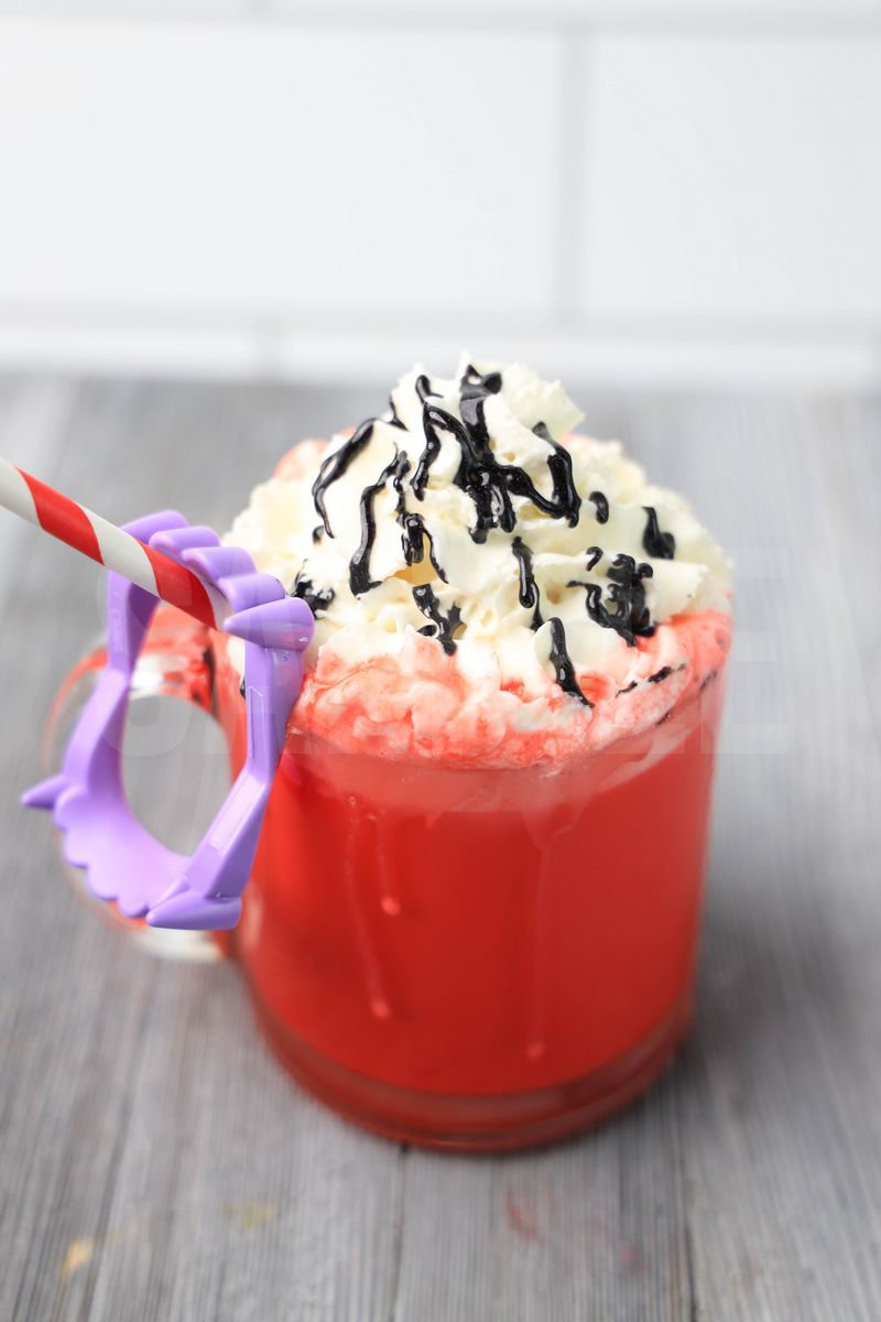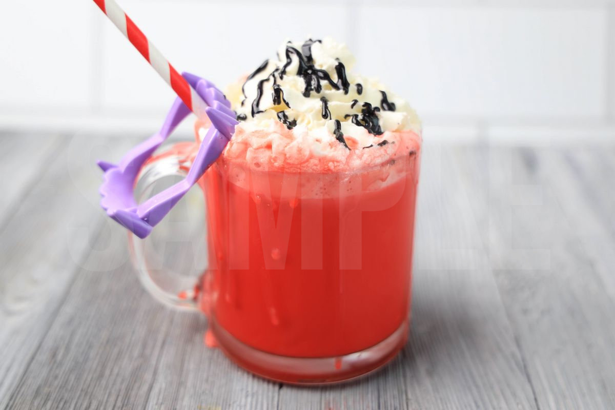 Vampire Hot Chocolate is made with white chocolate chips, red food gel, and milk. This is a semi exclusive recipe. The Vampire Hot Chocolate comes in a glass coffee mug on a gray wood backdrop. Set comes with 7 in process (in process are the same for all sets) and 15 final shots (finals are different for each set) along with recipe in text format. Both vertical and horizontal shots are available for social media. One set of four. Sample removed on finals.