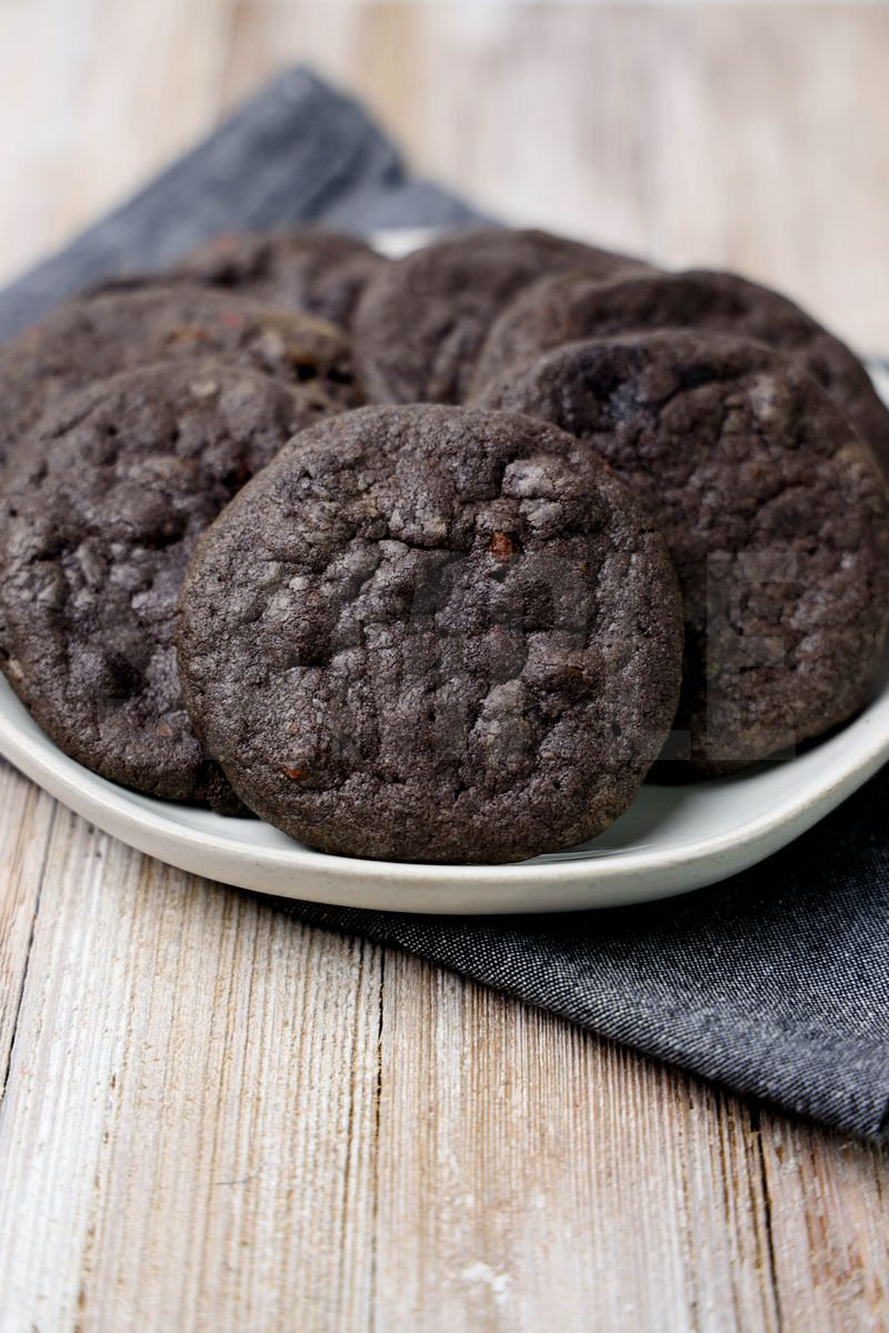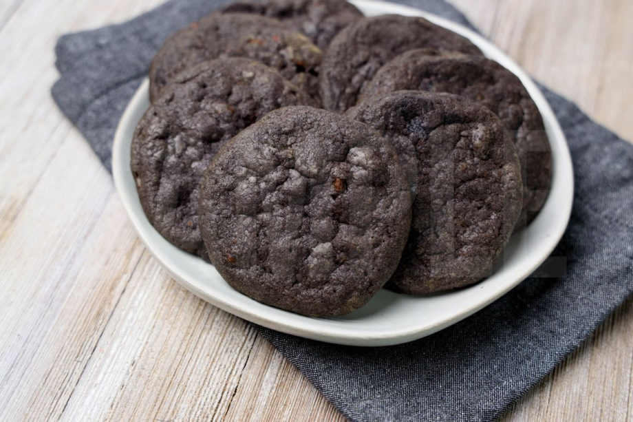 Wednesday Addams Chocolate Chip Cookies is made with pre-made chocolate chip cookie dough and black food gel. This is a semi exclusive recipe. The Wednesday Addams Chocolate Chip Cookies comes a denim napkin on a rustic wood backdrop. Set comes with 8 in process (in process are the same for all sets) and 16 final shots (finals are different for each set) along with recipe in text format. Both vertical and horizontal shots are available for social media. One set of four. Sample removed on finals.